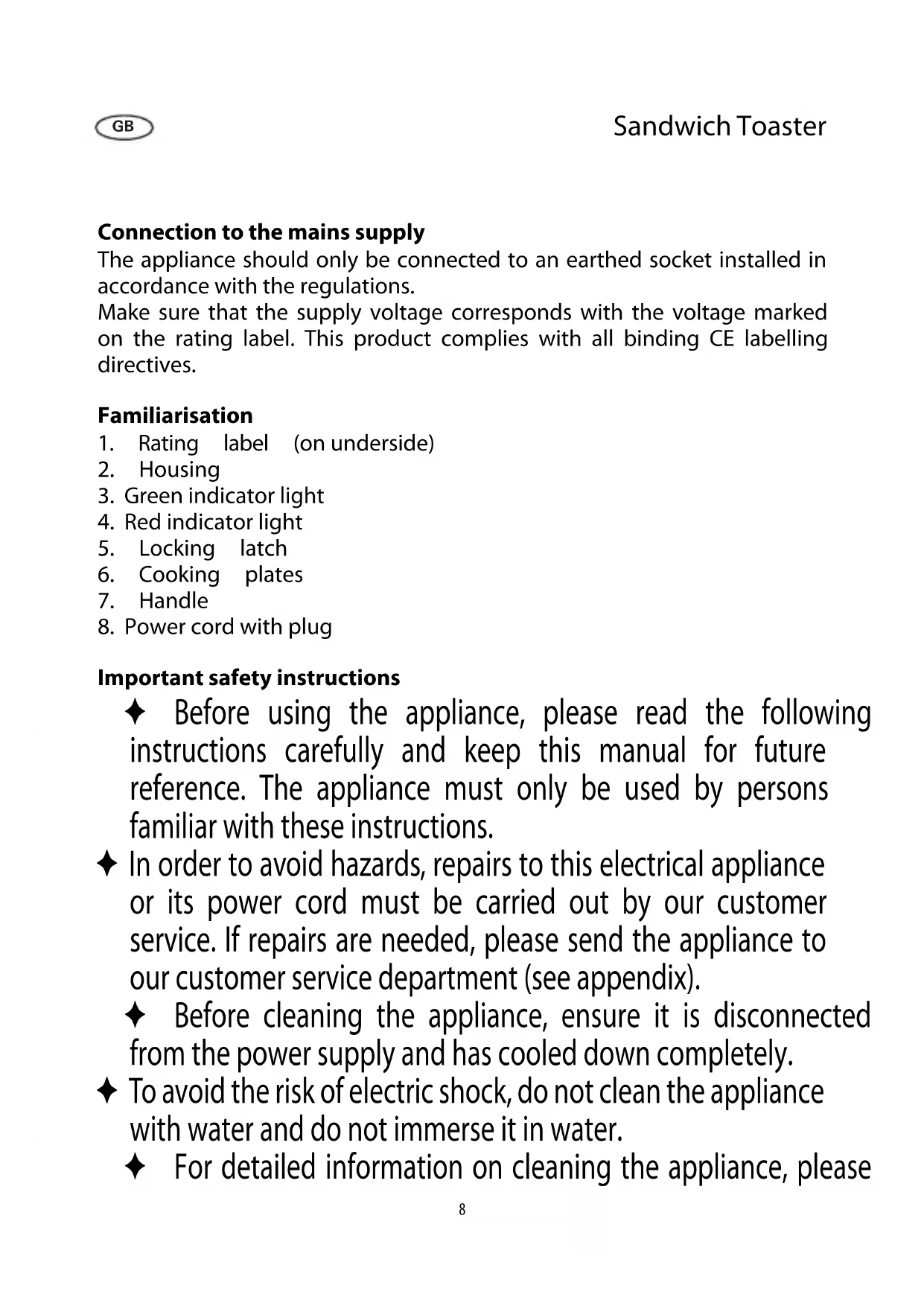Caution: This symbol indicates that the accessible housing surfaces may become very hot during operation. Do not touch any part of the appliance except the handle; use suitable oven cloths if necessary. ✦ This appliance may be used by children (at least 8 years of age) and by persons with reduced physical, sensory or mental capabilities, or lacking experience and knowledge, provided they have been given supervision or instruction concerning the use of the appliance and fully understand all dangers and safety precautions involved. ✦ Children must not be permitted to play with the appliance. ✦ Children must not be permitted to carry out any cleaning or maintenance work on the appliance unless they are supervised and at least 8 years of age. ✦ The appliance and its power cord must be kept well away from children under 8 at all times. ✦ Caution: Keep any packaging materials well away from children – these are a potential source of danger, e.g. of su ocation. ✦ Every time the appliance is used, the main body including the power cord as well as any attachment tted should be checked thoroughly for any defects. Should the appliance, for instance, have been dropped onto a hard surface, or if excessive force has been used to pull the power cord, it must no longer be used: even invisible damage may have adverse e ects on the operational safety of the appliance. ✦ Take care that neither the housing nor the cable get in touch with hot surfaces such as the hot plates of an electric stove, or with a hot gas ame. ✦ Alw ays remove the plug from the wall socket - after use, - in case of any malfunction, and10 - before cleaning the appliance. ✦ When removing the plug from the wall socket, never pull on the power cord; always grip the plug itself. ✦ Do not let the power cord hang free. ✦ Before moving or storing the appliance, ensure it has cooled down completely. ✦ Always place the appliance on a heat-resistant work surface impervious to splashes and stains with su cient surrounding space. ✦ Do not allow the appliance to operate without supervision, and do not place it underneath curtains, wall-cupboards or near any combustible materials. ✦ No responsibility is accepted if damage results from improper use, or if these instructions are not complied with. ✦ This appliance is intended for domestic or similar applications, such as - in shops, o ces and other similar working environments, - in agricultural working environments, - by customers in hotels, motels etc. and similar establishments, - in bed-and breakfast type environments. Initial use ✦ Remove the appliance completely from its packaging. ✦ Let the appliance heat up for about 10 minutes with the cooking plates closed. This will remove the smell typically encountered when switching on the appliance for the rst time. Please ensure su cient ventilation. ✦ Clean the appliance afterwards as described in the section Cleaning and Care. Operation ✦ Insert the plug into the wall socket. The main indicator light comes on. ✦ After a short warm-up period of around 8 minutes, the appliance is ready for use. Once the required temperature has been reached, the green ready-light comes on. ✦ Open the two housing elements. ✦ Place the two prepared sandwiches on the lower cooking plate and gently close the upper element. ✦ Press both elements together using the handles, and lock them securely by means of the locking latch. Caution: Do not try to close the elements by force; if they are di cult to close, reduce the amount of food. ✦ The cooking time is in general 3 to 4 minutes, depending on the bread and lling. ✦ Unlatch the locking device, open the appliance and take out the sandwiches. In order to prevent the non-stick plates from being11 damaged, do not use sharp or pointed objects while removing the sandwiches. ✦ If you want to prepare more sandwiches, close the top element and wait until the green ready-light comes on again before repeating the next toasting cycle. ✦ Remove the plug from the wall socket after use. The main indicator light will go out. Clean the appliance afterwards. Cleaning and care ✦ Before cleaning, remove the plug from the wall socket and wait until the appliance has cooled down with the cooking plates open. ✦ For reasons of electrical safety, never use water or any other kind of liquid on the appliance, nor immerse it. ✦ Do not use abrasives or harsh cleaning agents. ✦ With its non-stick cooking plates, the appliance requires little maintenance. The plates may be cleaned with a soft damp cloth or a soft brush. ✦ The exterior of the housing can be cleaned with a soft damp cloth. Disposal Devices marked with this symbol must be disposed of separately from your household waste, as they contain valuable materials which can be recycled. Proper disposal protects the environment and human health. Your local authority or retailer can provide information on the matter. Guarantee This product is guaranteed against defects in materials and workmanship for a period of two years from the date of purchase. Under this guarantee the manufacturer undertakes to repair or replace any parts found to be defective, providing the product is returned to one of our authorised service centres. This guarantee is only valid if the appliance has been used in accordance with the instructions, and provided that it has not been modi ed, repaired or interfered with by any unauthorised person, or damaged through misuse. This guarantee naturally does not cover wear and tear, nor breakables such as glass and ceramic items, bulbs etc. This guarantee does not a ect your statutory rights, nor any legal rights you may have as a consumer under applicable national legislation governing the purchase of goods. If the product fails to operate and needs to be returned, pack it carefully, enclosing your name and address and the reason for return. If within the guarantee period, please also provide the guarantee card and proo