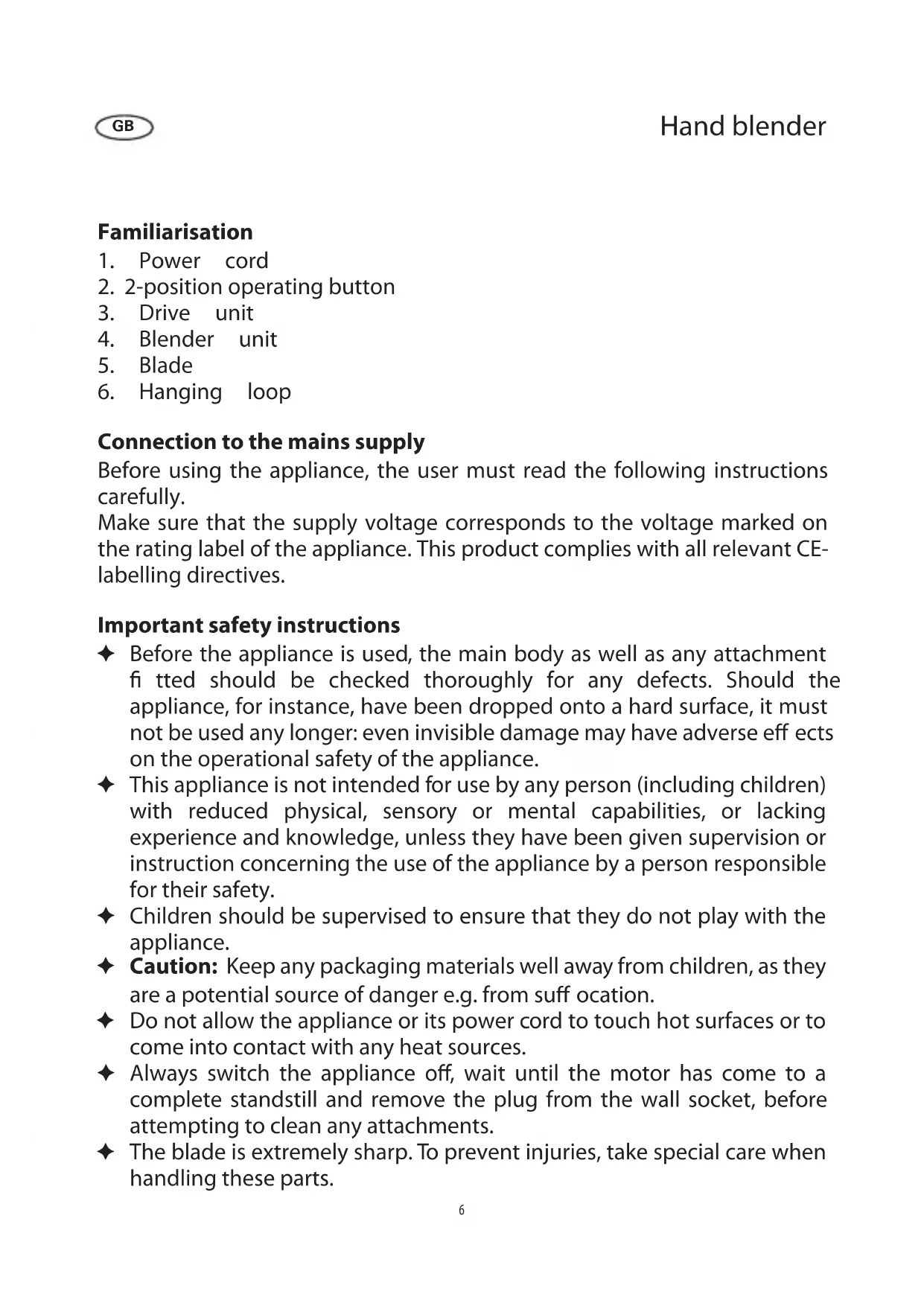 Connection to the mains supply Before using the appliance, the user must read the following instructions carefully. Make sure that the supply voltage corresponds to the voltage marked on the rating label of the appliance. This product complies with all relevant CE- labelling directives. Important safety instructions Before the appliance is used, the main body as well as any attachment ✦ tted should be checked thoroughly for any defects. Should the appliance, for instance, have been dropped onto a hard surface, it must not be used any longer: even invisible damage may have adverse e ects on the operational safety of the appliance. This appliance is not intended for use by any person (including children) ✦ with reduced physical, sensory or mental capabilities, or lacking experience and knowledge, unless they have been given supervision or instruction concerning the use of the appliance by a person responsible for their safety. Children should be supervised to ensure that they do not play with the ✦ appliance. Caution: ✦ Keep any packaging materials well away from children, as they are a potential source of danger e.g. from su ocation. Do not allow the appliance or its power cord to touch hot surfaces or to ✦ come into contact with any heat sources. Always switch the appliance o , wait until the motor has come to a ✦ complete standstill and remove the plug from the wall socket, before attempting to clean any attachments. The blade is extremely sharp. To prevent injuries, take special care when ✦ handling these parts.