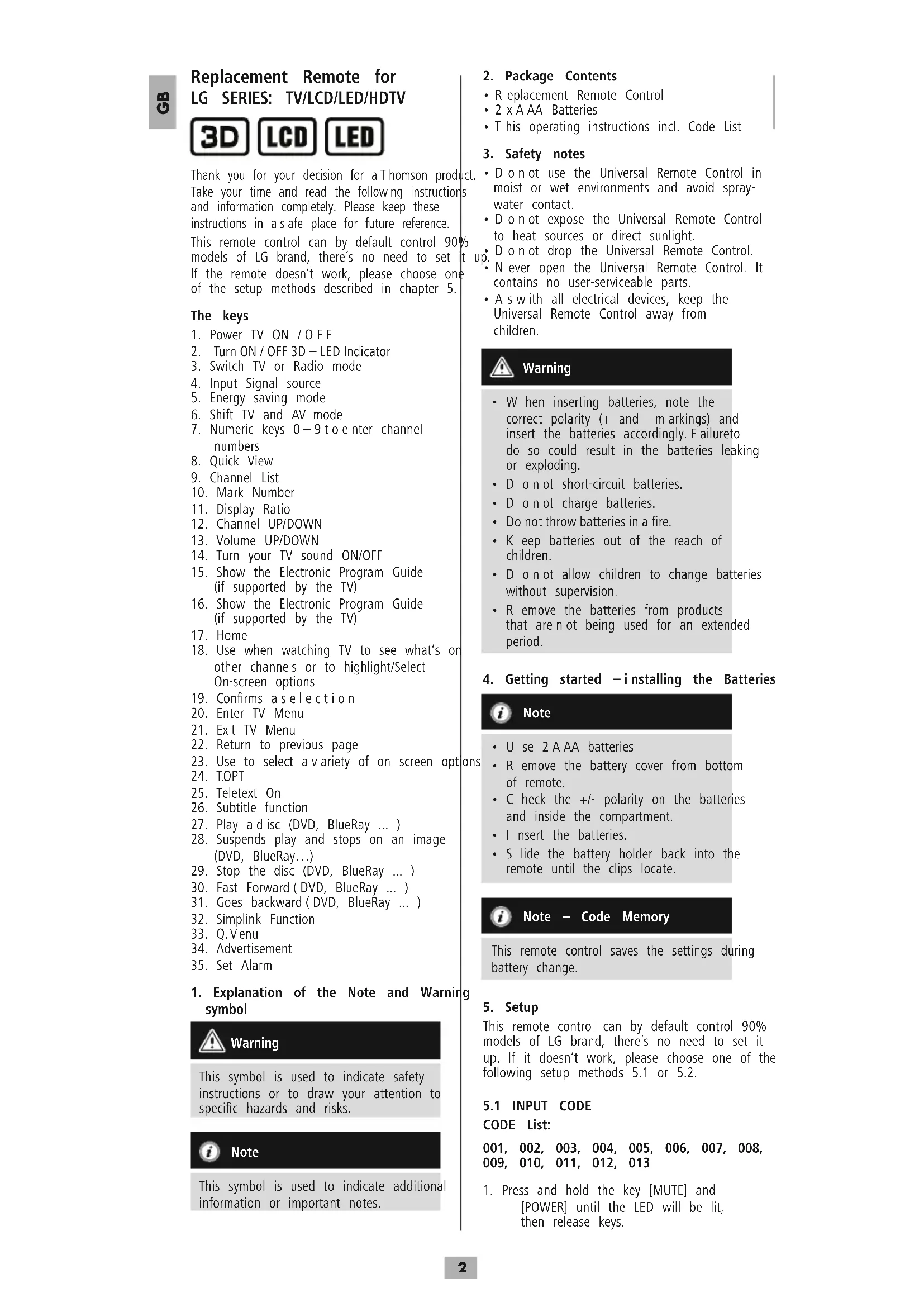 Thank you for your decision for aThomson product. Take your time and read the following instructions and information completely. Please keep these instructions in asafe place for future reference. This remote control can by default control 90% models of LG brand, there´s no need to set it up. lf the remote doesn‘t work, please choose one of the setup methods described in chapter 5. The keys