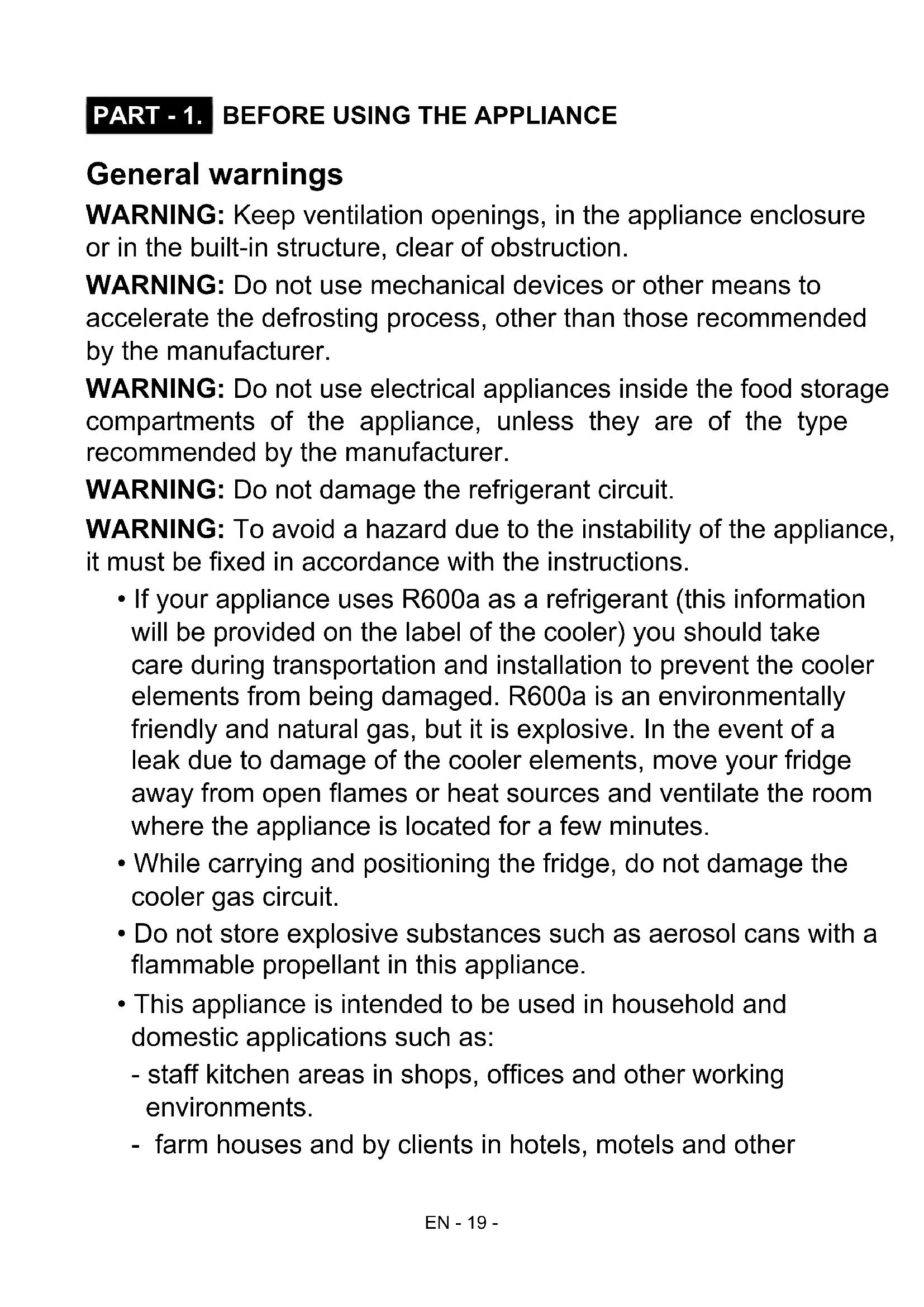 PART - 1. BEFORE USING THE APPLIANCE