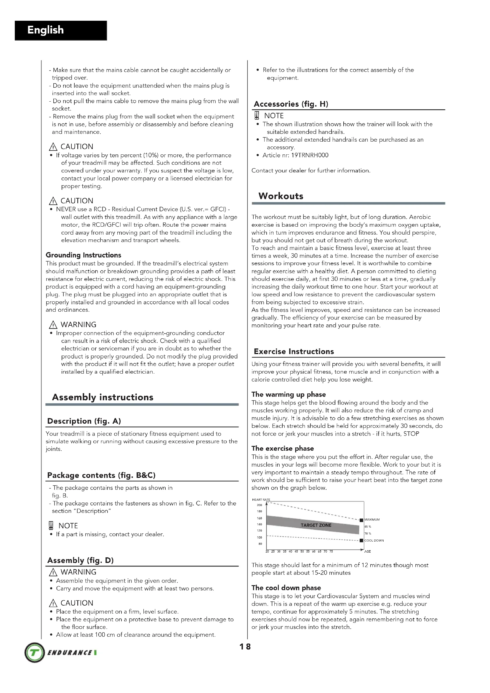- The shown illustration shows how the trainer will look with the suitable extended handrails. • The additional extended handrails can be purchased as an accessory.• Article nr: 19TRNRH000Contact your dealer for further information. Workouts The workout must be suitably light, but of long duration. Aerobic exercise is based on improving the body’s maximum oxygen uptake, which in turn improves endurance and fitness. You should perspire, but you should not get out of breath during the workout. To reach and maintain a basic fitness level, exercise at least three times a week, 30 minutes at a time. Increase the number of exercise sessions to improve your fitness level. It is worthwhile to combine regular exercise with a healthy diet. A person committed to dieting should exercise daily, at first 30 minutes or less at a time, gradually increasing the daily workout time to one hour. Start your workout at low speed and low resistance to prevent the cardiovascular system from being subjected to excessive strain. As the fitness level improves, speed and resistance can be increased gradually. The efficiency of your exercise can be measured by monitoring your heart rate and your pulse rate. Exercise Instructions Using your fitness trainer will provide you with several benefits, it will improve your physical fitness, tone muscle and in conjunction with a calorie controlled diet help you lose weight. The warming up phase This stage helps get the blood flowing around the body and the muscles working properly. It will also reduce the risk of cramp and muscle injury. It is advisable to do a few stretching exercises as shown below. Each stretch should be held for approximately 30 seconds, do not force or jerk your muscles into a stretch - if it hurts, STOP The exercise phase This is the stage where you put the effort in. After regular use, the muscles in your legs will become more flexible. Work to your but it is very important to maintain a steady tempo throughout. The rate of work should be sufficient to raise your heart beat into the target zone shown on the graph below.