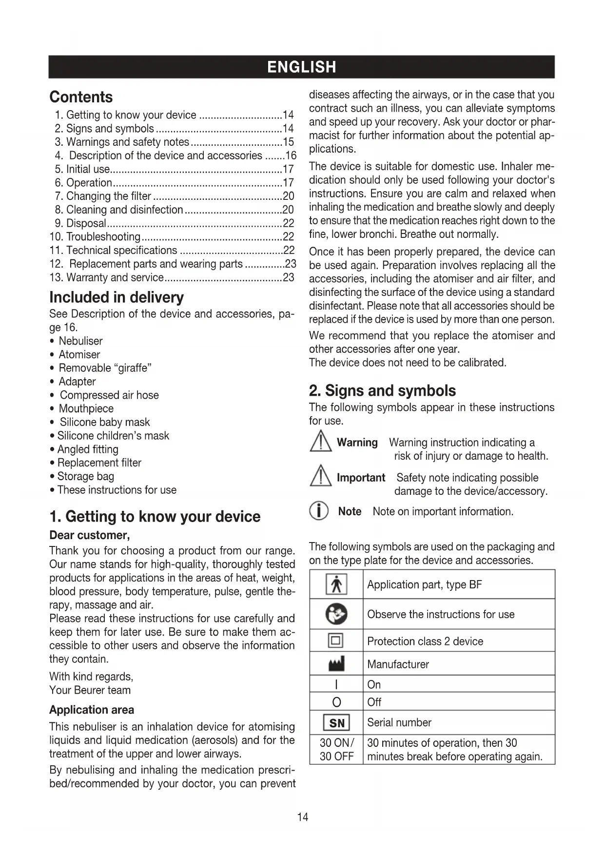 Dear customer, Thank you for choosing a product from our range. Our name stands for high-quality, thoroughly tested products for applications in the areas of heat, weight, blood pressure, body temperature, pulse, gentle the- rapy, massage and air. Please read these instructions for use carefully and keep them for later use. Be sure to make them ac- cessible to other users and observe the information they contain. With kind regards, Your Beurer team Application area This nebuliser is an inhalation device for atomising liquids and liquid medication (aerosols) and for the treatment of the upper and lower airways. By nebulising and inhaling the medication prescri- bed/recommended by your doctor, you can prevent diseases affecting the airways, or in the case that you contract such an illness, you can alleviate symptoms and speed up your recovery. Ask your doctor or phar