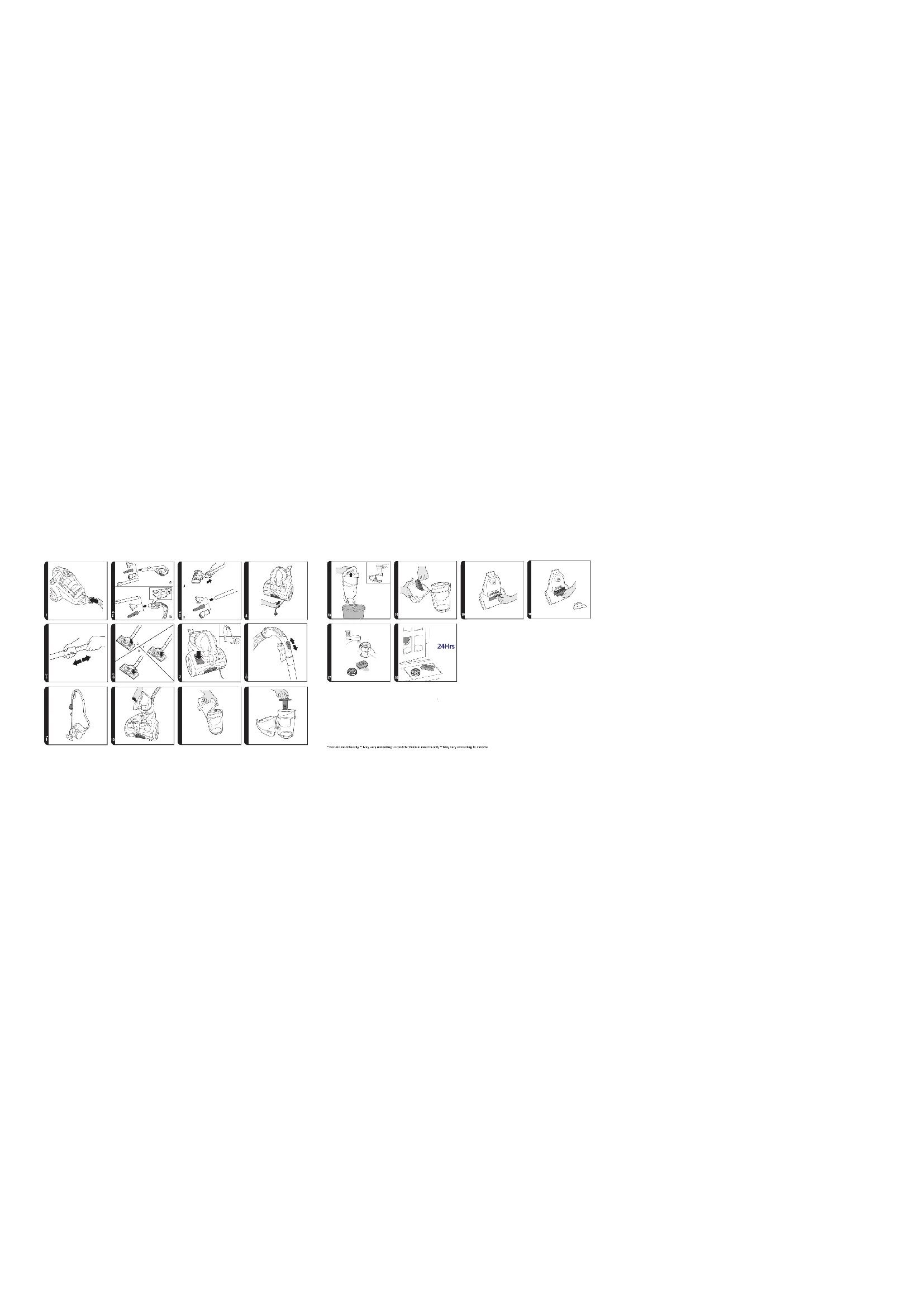 press the oor type selector pedal* on the nozzle to select the ideal cleaning mode:: Hard Floor – Brushes are lowered to protect the oor. Carpet – Brushes are raised for deeper cleaning. Carpet & Floor Nozzle**: [6] - HardoorCleaning: Press the pedal on the nozzle on Hard Floor mode and adjust the slider on the nozzle on ALL FLOORS. In this position brushes, wheels and wiper blade are ACCESSORIES To obtain the best performance and efciency it is recommended that the correct nozzles are used for the main cleaning operations. These nozzles are indicated in the diagrams by the letters GP, HF or CA. A nozzle type GP can be used to clean both carpet and hard floor. A nozzle type HF is suitable for use only on hard oor. A nozzle of type CA is suitable for use only on carpet. The other nozzles are accessories for specialist cleaning tasks and are recommended for occasional use only. The crevice tool*, furniture nozzle* and dusting brush** are stored on the telescopic tube through a practical accessories’ holder. They can be tted to the handle or the end of telescopic tube. On certain models the dusting brush is conveniently integrated in the hose handle. DustingBrush**– For bookshelves, frames, keyboards and other delicate areas. [X1] CreviceTool*– For corners and hard to reach areas. [X2] FurnitureNozzle*– For soft furniture and fabrics. [X3] ParquetNozzle*– For parquet oors and other delicate oors. [AA] Pet Hair Remover Mini Turbo Nozzle* - Use the mini turbo nozzle on stairs or for deep cleaning on textile surfaces and other hard to clean areas. Particularly suitable for pet hair removal. [Y] AllergenRemoverMiniTurboNozzle*–Use the mini turbo nozzle on stairs or for deep cleaning on textile surfaces and other hard to clean areas. Particularly suitable for allergen removal. [Z] IMPORTANT: Do not use mini turbo nozzles on rugs with long fringes, animal hides and lowered to protect hard oors. [6a] - StandardCarpet&RugsCleaning: Press the pedal on the nozzle on Carpet mode and adjust the slider on the nozzle on ALL FLOORS. In this position brushes and wiper blade are raised while wheels are lowered to allow a perfect ease of movement on such surfaces. [6b] - DeepCarpetcleaning: Press the pedal on the nozzle on Carpet mode and adjust the slider on the nozzle on DEEP CARPET CLEANING. In this position brushes, wheels and wiper blade are raised for a deeper cleaning of your carpet. [6c]