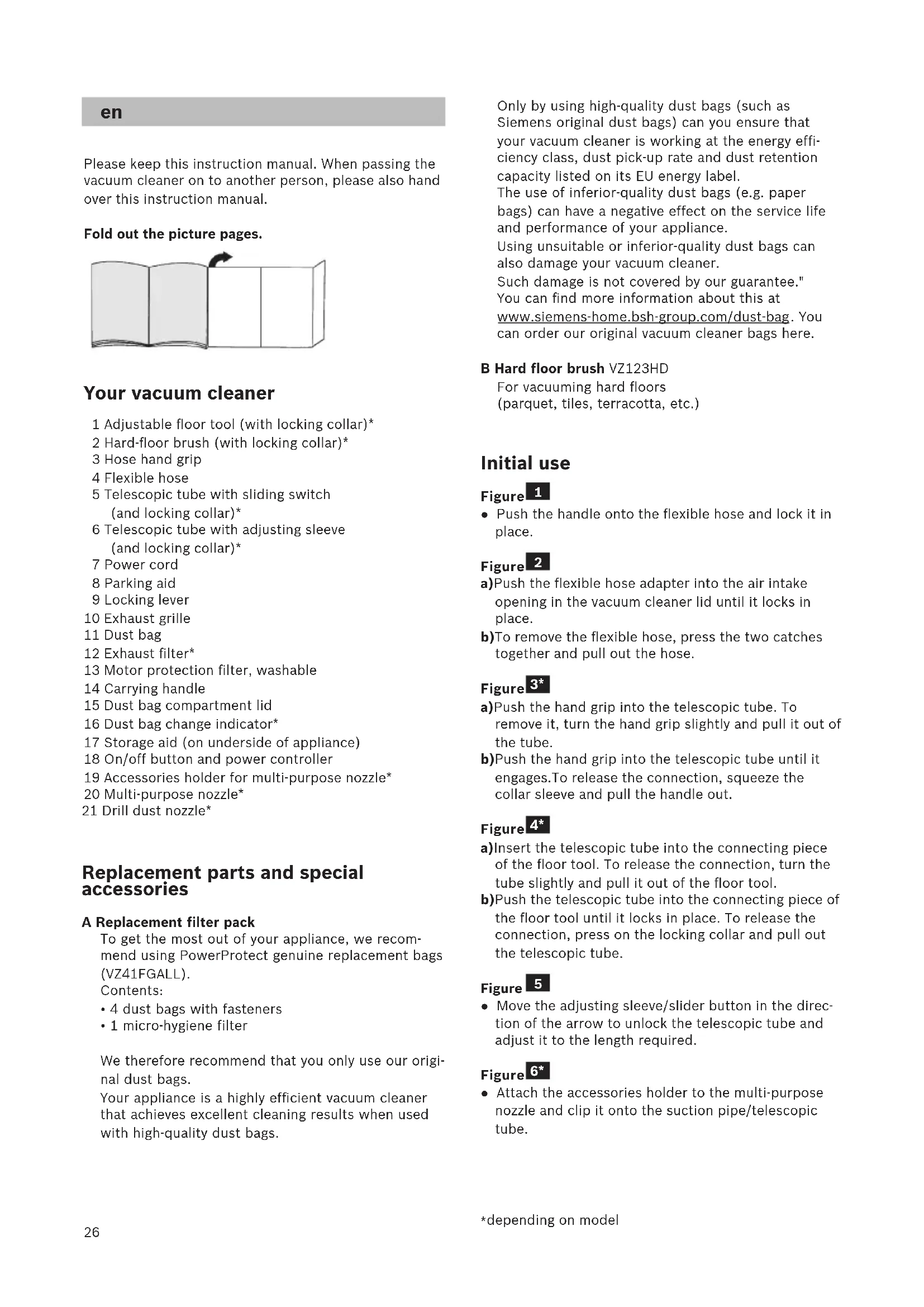 je nach Ausstattung26 Please keep this instruction manual. When passing the vacuum cleaner on to another person, please also hand over this instruction manual. Fold out the picture pages. Your vacuum cleaner 1 Adjustable floor tool (with locking collar)* 2 Hard-floor brush (with locking collar)* 3 Hose hand grip 4 Flexible hose 5 Telescopic tube with sliding switch (and locking collar)* 6 Telescopic tube with adjusting sleeve (and locking collar)* 7 Power cord 8 Parking aid 9 Locking lever 10 Exhaust grille 11 Dust bag 12 Exhaust filter* 13 Motor protection filter, washable 14 Carrying handle 15 Dust bag compartment lid 16 Dust bag change indicator* 17 Storage aid (on underside of appliance) 18 On/off button and power controller 19 Accessories holder for multi-purpose nozzle* 20 Multi-purpose nozzle* 21 Drill dust nozzle* Replacement parts and special accessories A Replacement filter pack To get the most out of your appliance, we recom- mend using PowerProtect genuine replacement bags (VZ41FGALL). Contents: