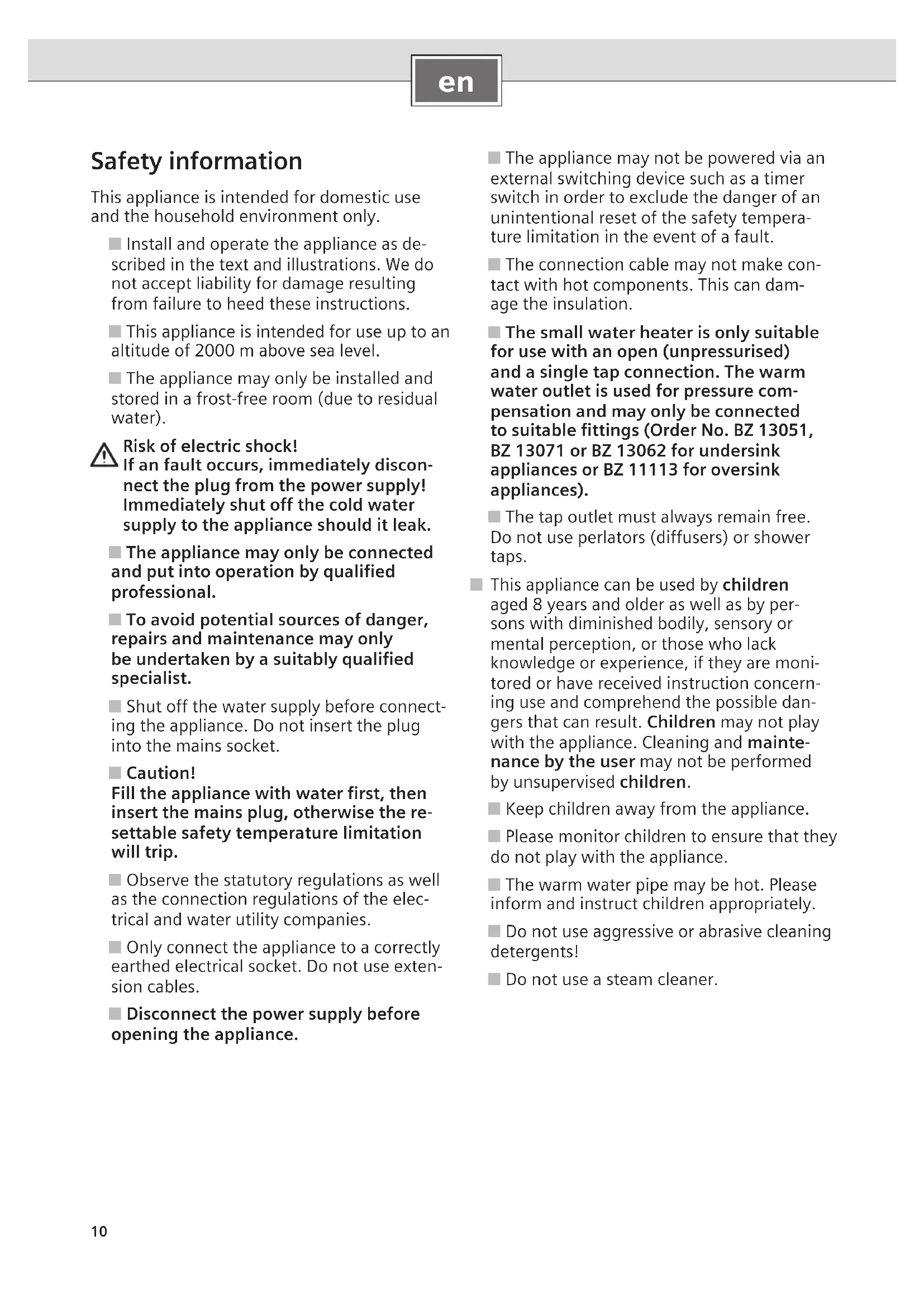Safety information This appliance is intended for domestic use and the household environment only. ■ Install and operate the appliance as de- scribed in the text and illustrations. We do not accept liability for damage resulting from failure to heed these instructions. ■ This appliance is intended for use up to an altitude of 2000 m above sea level. ■ The appliance may only be installed and stored in a frost-free room (due to residual water). Risk of electric shock! If an fault occurs, immediately discon- nect the plug from the power supply! Immediately shut off the cold water supply to the appliance should it leak. ■ The appliance may only be connected and put into operation by qualified professional. ■ To avoid potential sources of danger, repairs and maintenance may only be undertaken by a suitably qualified specialist. ■ Shut off the water supply before connect- ing the appliance. Do not insert the plug into the mains socket. ■ Caution! Fill the appliance with water first, then insert the mains plug, otherwise the re- settable safety temperature limitation will trip. ■ Observe the statutory regulations as well as the connection regulations of the elec- trical and water utility companies. ■ Only connect the appliance to a correctly earthed electrical socket. Do not use exten- sion cables. ■ Disconnect the power supply before opening the appliance. ■ The appliance may not be powered via an external switching device such as a timer switch in order to exclude the danger of an unintentional reset of the safety tempera- ture limitation in the event of a fault. ■ The connection cable may not make con- tact with hot components. This can dam- age the insulation. ■ The small water heater is only suitable for use with an open (unpressurised) and a single tap connection. The warm water outlet is used for pressure com- pensation and may only be connected to suitable fittings (Order No. BZ 13051, BZ 13071 or BZ 13062 for undersink appliances or BZ 11113 for oversink appliances). ■ The tap outlet must always remain free. Do not use perlators (diffusers) or shower taps. ■ This appliance can be used by children aged 8 years and older as well as by per- sons with diminished bodily, sensory or mental perception, or those who lack knowledge or experience, if they are moni- tored or have received instruction concern- ing use and comprehend the possible dan- gers that can result. Children may not play with the appliance. Cleaning and mainte- nance by the user may not be performed by unsupervised children. ■ Keep children away from the appliance. ■ Please monitor children to ensure that they do not play with the appliance. ■ The warm water pipe may be hot. Please inform and instruct children appropriately. ■ Do not use aggressive or abrasive cleaning detergents! ■ Do not use a steam cleaner.11