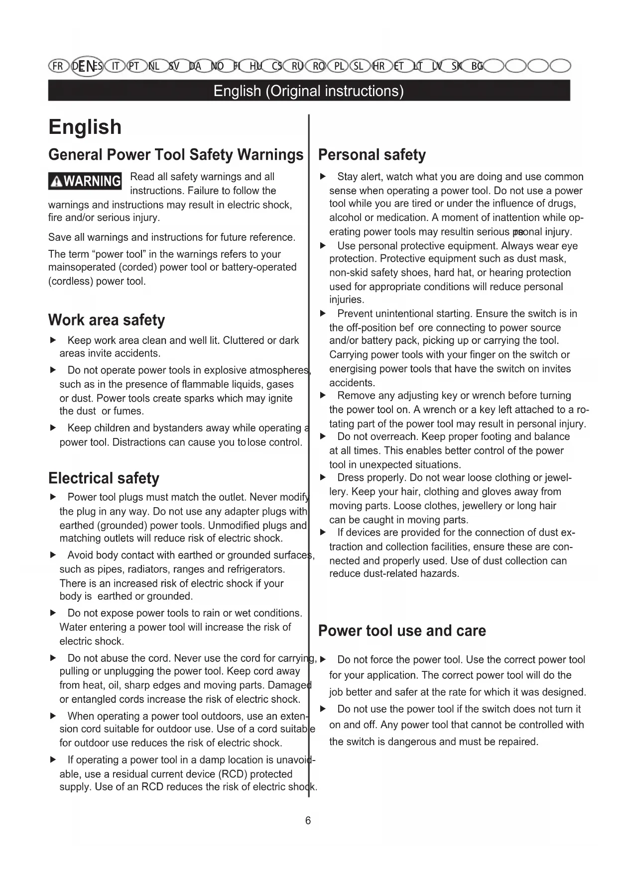 FR DE ES IT PT NL SV DA NO FI HU CS RU RO PL SL HR ET LT LV SK BGEnglish (Original instructions) Maintain power tools. Check for misalignment or bind- ing of moving parts, breakage of parts and any other condition that may affect the power tool’s operation. If damaged, have the power tool repaired before use. Many accidents are caused by poorly maintained power tools. Keep cutting tools sharp and clean. Properly mainta- ined cutting tools with sharp cutting edges are less likely to bind and are easier to control. Use the power tool, accessories and tool bits etc. in accordance with these instructions, taking into account the working conditions and the work to be performed. Use of the power tool for operations different from those intended could result in a hazardous situation. Battery tool use and care Recharge only with the charger specified by the manufacturer. A charger that is suitable for one type of battery pack may create a risk of fire when used with another battery pack. Use power tools only with specifically designated bat- tery packs. Use of any other battery packs may create a risk of injury and fire. When battery pack is not in use, keep it away from other metal objects, like paper clips, coins, keys, nails, screws or other small metal objects, that can make a connection from one terminal to another. Shorting the battery terminals together may cause burns or a fire. Under abusive conditions, liquid may be ejected from the battery; avoid contact. If contact accidentally oc- curs, flush with water. If liquid contacts eyes, addition- ally seek medical help. Liquid ejected from the battery may cause irritation or burns. Service Have your power tool serviced by a qualified repair person using only identical replacement parts. This will ensure that the safety of the power tool is maintained. Additional Safety and Working Instructions Before any work on the machine (e.g., maintenance, tool change, etc.) as well as during transport and storage, set the rotational direction switch to the centre position. Unintentional actuation of the On/Off switch can lead to injuries.