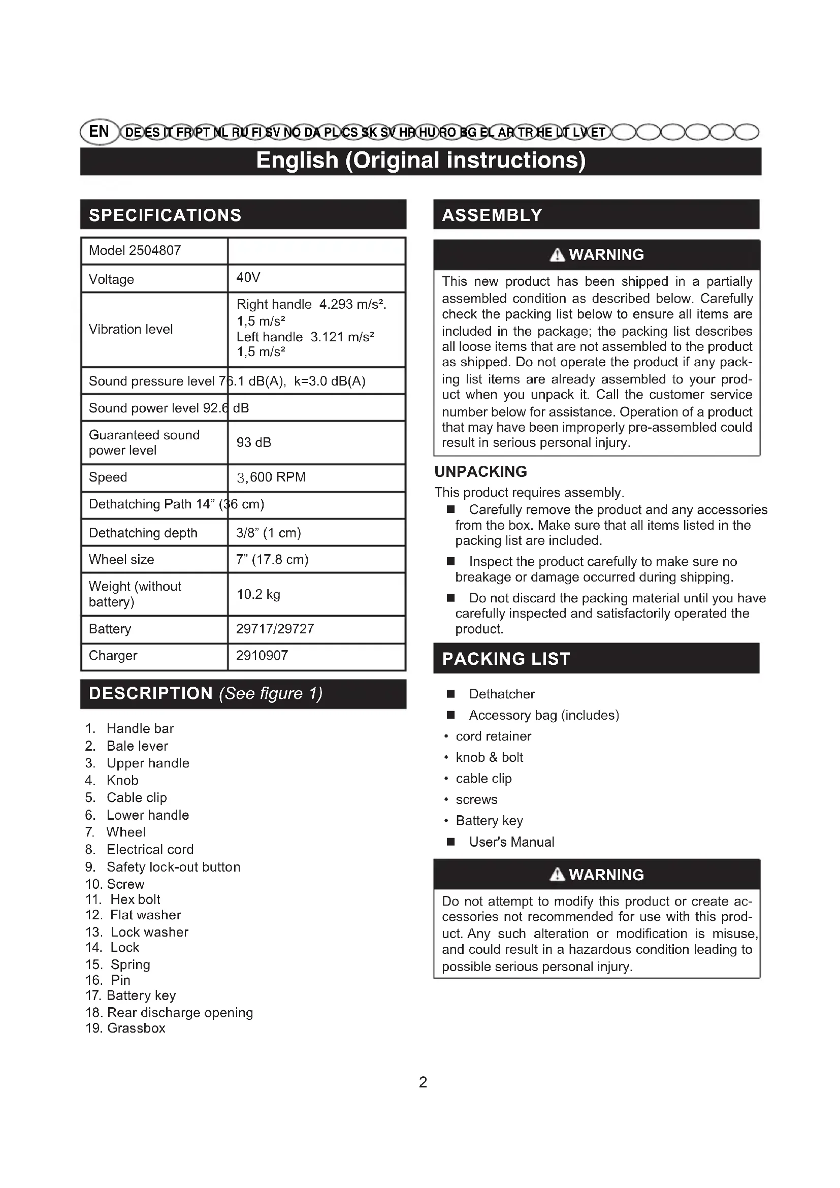 - Battery key User's Manual WARNING Do not attempt to modify this product or create ac- cessories not recommended for use with this prod- uct. Any such alteration or modication is misuse, and could result in a hazardous condition leading to possible serious personal injury. SPECIFICATIONS Model 2504807 Voltage 40V Vibration level Right handle 4.293 m/s². 1,5 m/s² Left handle 3.121 m/s² 1,5 m/s² Sound pressure level 76.1 dB(A), k=3.0 dB(A) Sound power level 92.6 dB Guaranteed sound power level 93 dB Speed