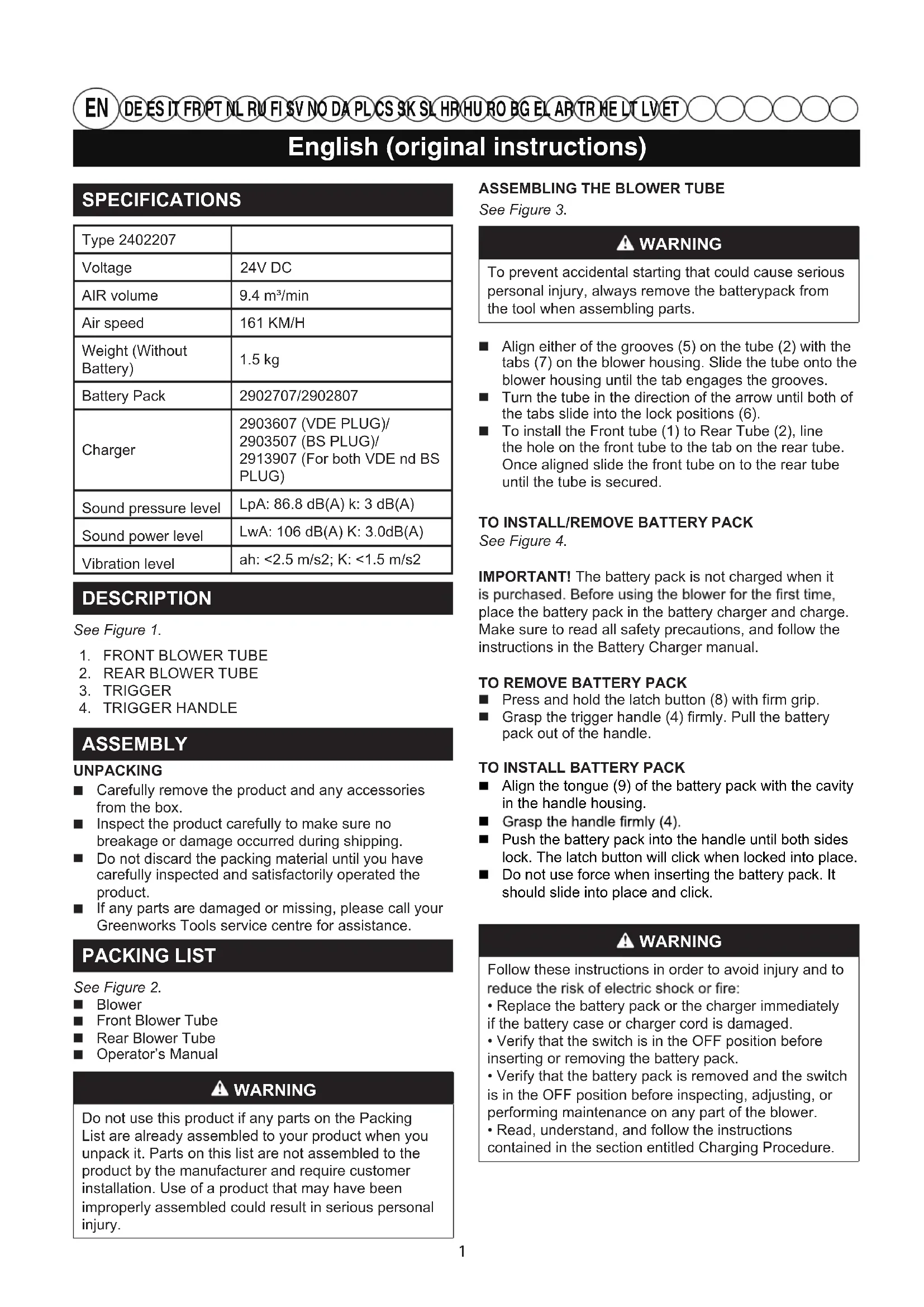 ASSEMBLY UNPACKING Carefully remove the product and any accessories from the box. Inspect the product carefully to make sure no breakage or damage occurred during shipping. Do not discard the packing material until you have carefully inspected and satisfactorily operated the product. If any parts are damaged or missing, please call your Greenworks Tools service centre for assistance. PACKING LIST See Figure 2. Blower Front Blower Tube Rear Blower Tube Operator’s Manual WARNING Do not use this product if any parts on the Packing List are already assembled to your product when you unpack it. Parts on this list are not assembled to the product by the manufacturer and require customer installation. Use of a product that may have been improperly assembled could result in serious personal injury.ASSEMBLING THE BLOWER TUBE See Figure 3. WARNING To prevent accidental starting that could cause seriouspersonal injury, always remove the batterypack fromthe tool when assembling parts. Align either of the grooves (5) on the tube (2) with the tabs (7) on the blower housing. Slide the tube onto the blower housing until the tab engages the grooves. Turn the tube in the direction of the arrow until both of the tabs slide into the lock positions (6). To install the Front tube (1) to Rear Tube (2), line the hole on the front tube to the tab on the rear tube. Once aligned slide the front tube on to the rear tube until the tube is secured.TO INSTALL/REMOVE BATTERY PACK See Figure 4.IMPORTANT! The battery pack is not charged when it place the battery pack in the battery charger and charge. Make sure to read all safety precautions, and follow the instructions in the Battery Charger manual.TO REMOVE BATTERY PACK Press and hold the latch button (8) with firm grip. Grasp the trigger handle (4) firmly. Pull the battery pack out of the handle.TO INSTALL BATTERY PACK Align the tongue (9) of the battery pack with the cavity in the handle housing. Push the battery pack into the handle until both sides lock. The latch button will click when locked into place. Do not use force when inserting the battery pack. It should slide into place and click. WARNING Follow these instructions in order to avoid injury and to • Replace the battery pack or the charger immediately if the battery case or charger cord is damaged.• Verify that the switch is in the OFF position before inserting or removing the battery pack.• Verify that the battery pack is removed and the switch is in the OFF position before inspecting, adjusting, or performing maintenance on any part of the blower.• Read, understand, and follow the instructions contained in the section entitled Charging Procedure. 1English (original instructions)