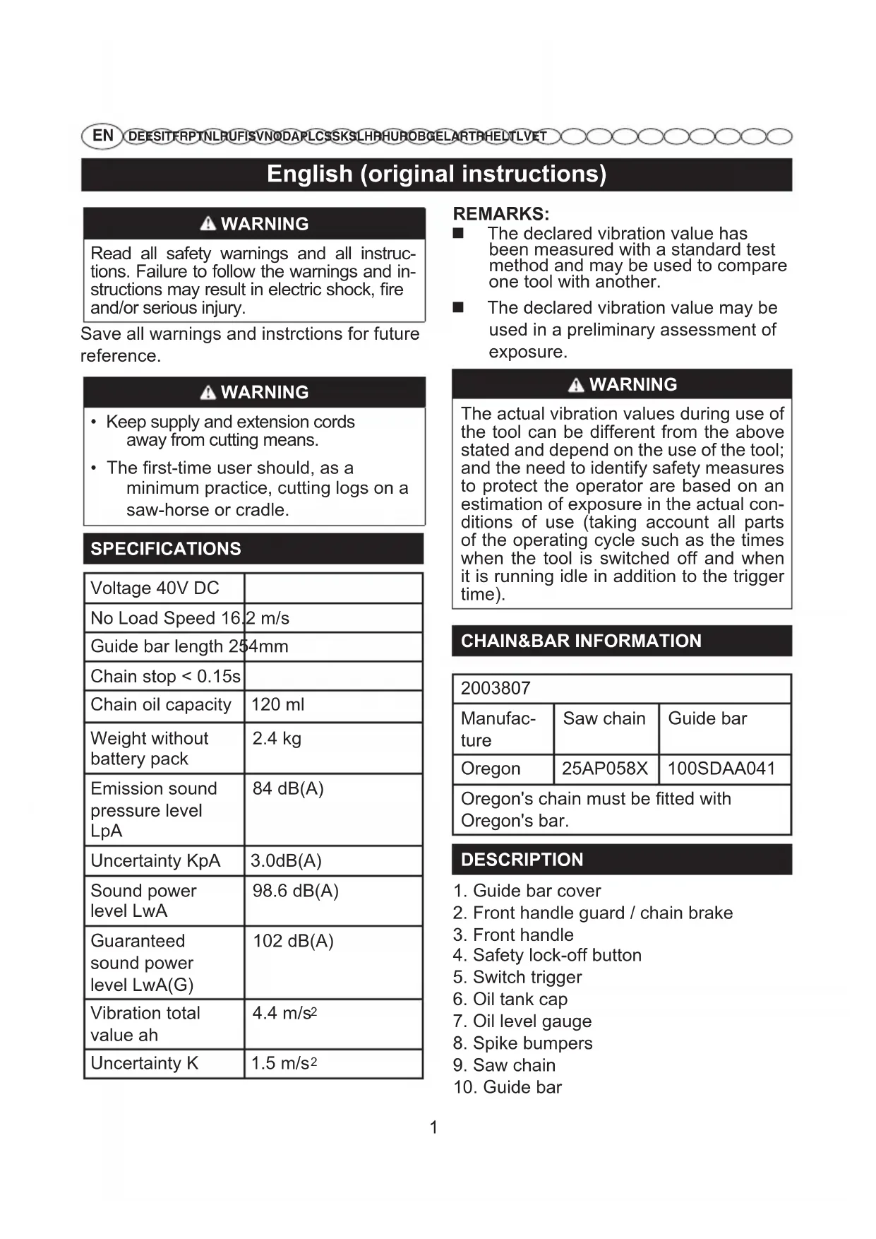 - The rst-time user should, as a minimum practice, cutting logs on a saw-horse or cradle. SPECIFICATIONS Voltage 40V DC No Load Speed 16.2 m/s Guide bar length 254mm Chain stop < 0.15s Chain oil capacity 120 ml Weight without battery pack