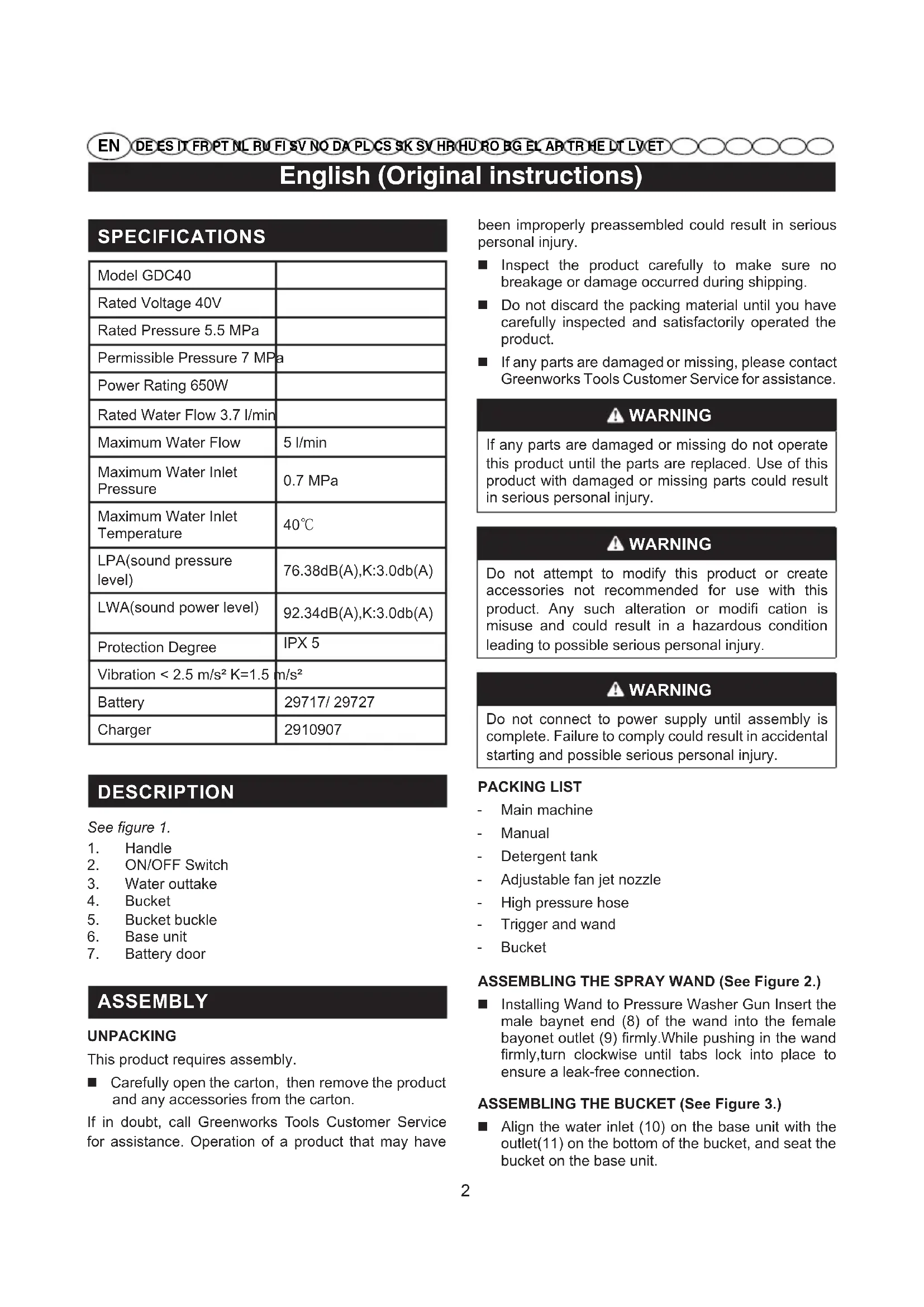 ASSEMBLY UNPACKING This product requires assembly. Carefully open the carton, then remove the product and any accessories from the carton. If in doubt, call Greenworks Tools Customer Service for assistance. Operation of a product that may have been improperly preassembled could result in serious personal injury. Inspect the product carefully to make sure no breakage or damage occurred during shipping. Do not discard the packing material until you have carefully inspected and satisfactorily operated the product. If any parts are damaged or missing, please contact Greenworks Tools Customer Service for assistance. WARNING If any parts are damaged or missing do not operate this product until the parts are replaced. Use of this product with damaged or missing parts could result in serious personal injury. WARNING Do not attempt to modify this product or create accessories not recommended for use with this product. Any such alteration or modifi cation is misuse and could result in a hazardous condition leading to possible serious personal injury. WARNING Do not connect to power supply until assembly is complete. Failure to comply could result in accidental starting and possible serious personal injury. PACKING LIST - Main machine - Manual - Detergent tank - Adjustable fan jet nozzle - High pressure hose - Trigger and wand - Bucket ASSEMBLING THE SPRAY WAND (See Figure 2.) Installing Wand to Pressure Washer Gun Insert the male baynet end (8) of the wand into the female bayonet outlet (9) firmly.While pushing in the wand firmly,turn clockwise until tabs lock into place to ensure a leak-free connection. ASSEMBLING THE BUCKET (See Figure 3.) Align the water inlet (10) on the base unit with the outlet(11) on the bottom of the bucket, and seat the bucket on the base unit.English (Original instructions)
