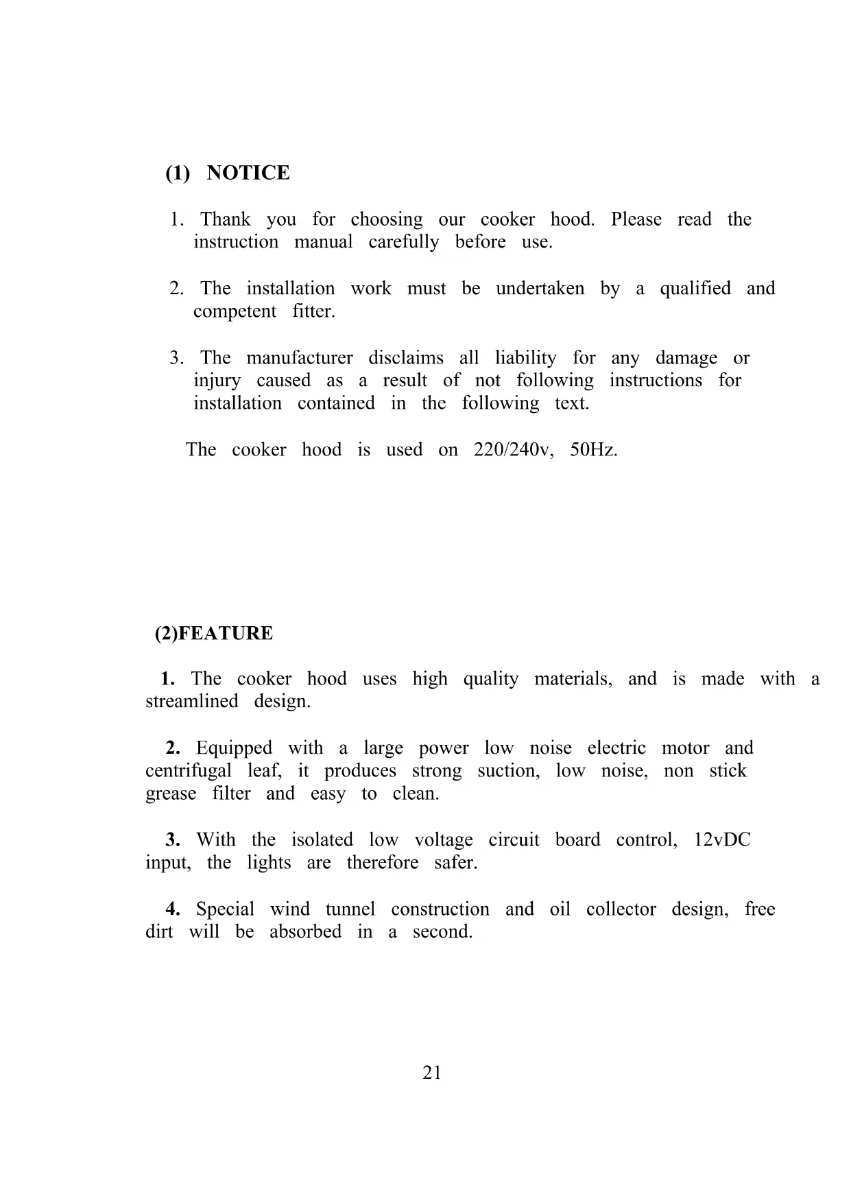 injury caused as a result of not following instructions for installation contained in the following text. The cooker hood is used on 220/240v, 50Hz. (2)FEATURE