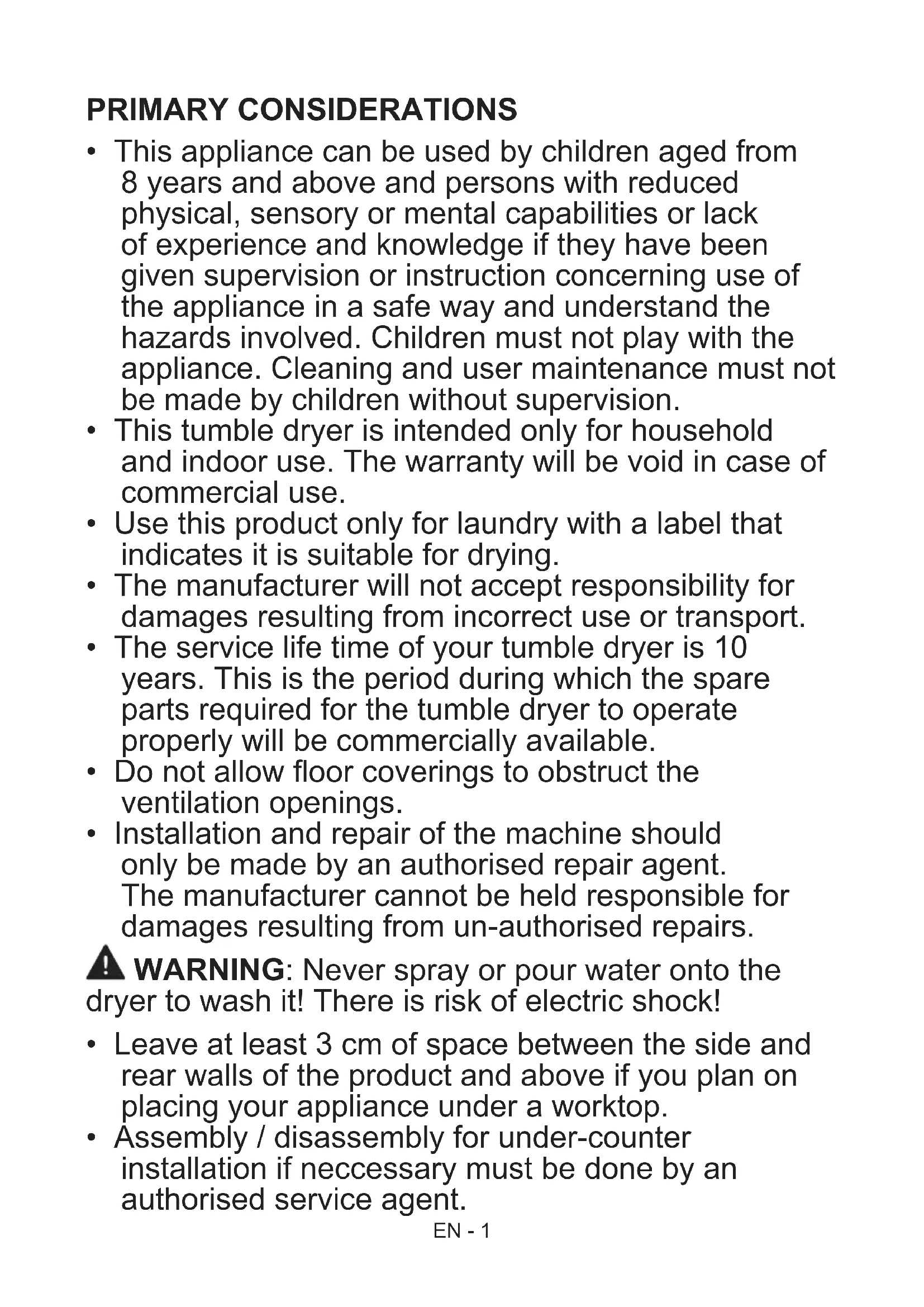 - This tumble dryer is intended only for household and indoor use. The warranty will be void in case of commercial use.