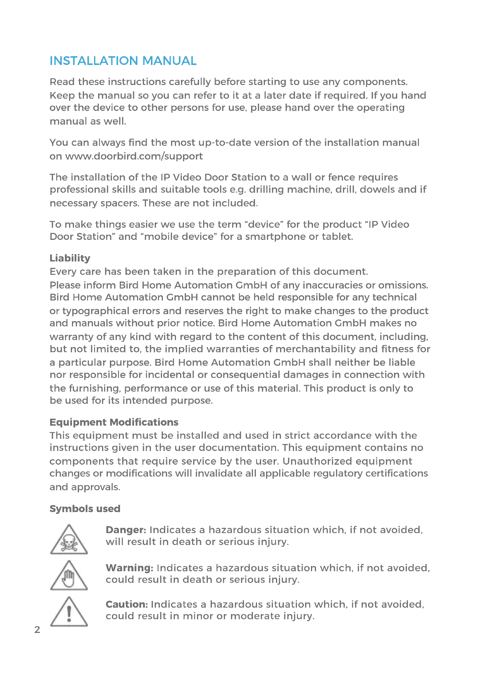 D20x Series22 INSTALLATION MANUAL Read these instructions carefully before starting to use any components. Keep the manual so you can refer to it at a later date if required. If you hand over the device to other persons for use, please hand over the operating manual as well. You can always find the most up-to-date version of the installation manual on www.doorbird.com/support The installation of the IP Video Door Station to a wall or fence requires professional skills and suitable tools e.g. drilling machine, drill, dowels and if necessary spacers. These are not included. To make things easier we use the term “device” for the product “IP Video Door Station” and “mobile device” for a smartphone or tablet. Liability Every care has been taken in the preparation of this document. Please inform Bird Home Automation GmbH of any inaccuracies or omissions. Bird Home Automation GmbH cannot be held responsible for any technical or typographical errors and reserves the right to make changes to the product and manuals without prior notice. Bird Home Automation GmbH makes no warranty of any kind with regard to the content of this document, including, but not limited to, the implied warranties of merchantability and fitness for a particular purpose. Bird Home Automation GmbH shall neither be liable nor responsible for incidental or consequential damages in connection with the furnishing, performance or use of this material. This product is only to be used for its intended purpose. Equipment Modifications This equipment must be installed and used in strict accordance with the instructions given in the user documentation. This equipment contains no components that require service by the user. Unauthorized equipment changes or modifications will invalidate all applicable regulatory certifications and approvals. Symbols used Caution: Indicates a hazardous situation which, if not avoided, could result in minor or moderate injury.