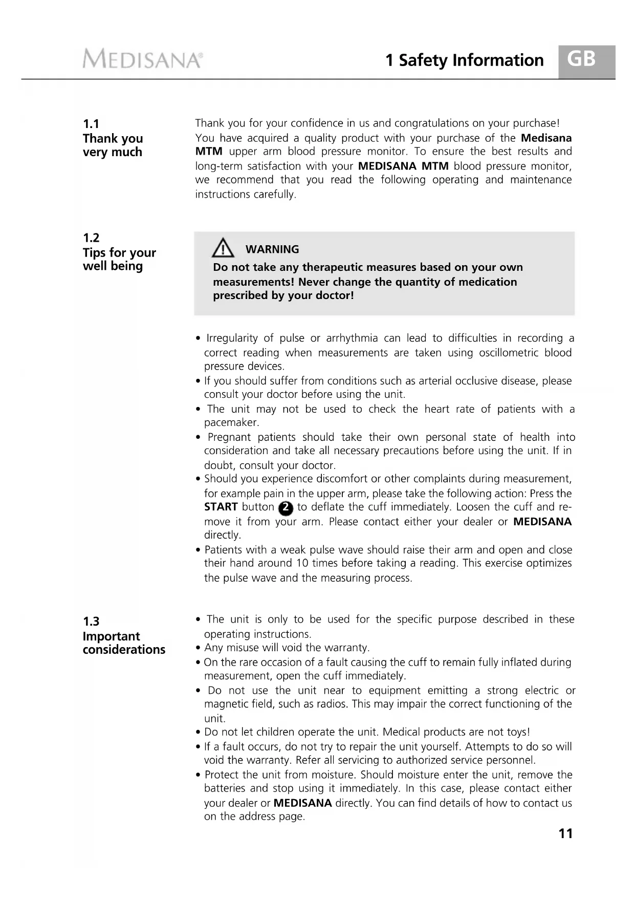 Thank you for your confidence in us and congratulations on your purchase! You have acquired a quality product with your purchase of the Medisana MTM upper arm blood pressure monitor. To ensure the best results and long-term satisfaction with your MEDISANA MTM blood pressure monitor, we recommend that you read the following operating and maintenance instructions carefully.