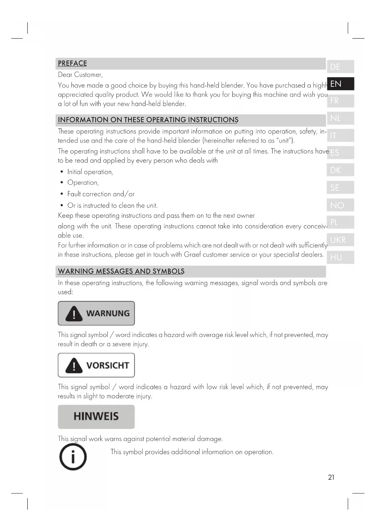 - Or is instructed to clean the unit. Keep these operating instructions and pass them on to the next owner along with the unit. These operating instructions cannot take into consideration every conceiv- able use. For further information or in case of problems which are not dealt with or not dealt with sufficiently in these instructions, please get in touch with Graef customer service or your specialist dealers.