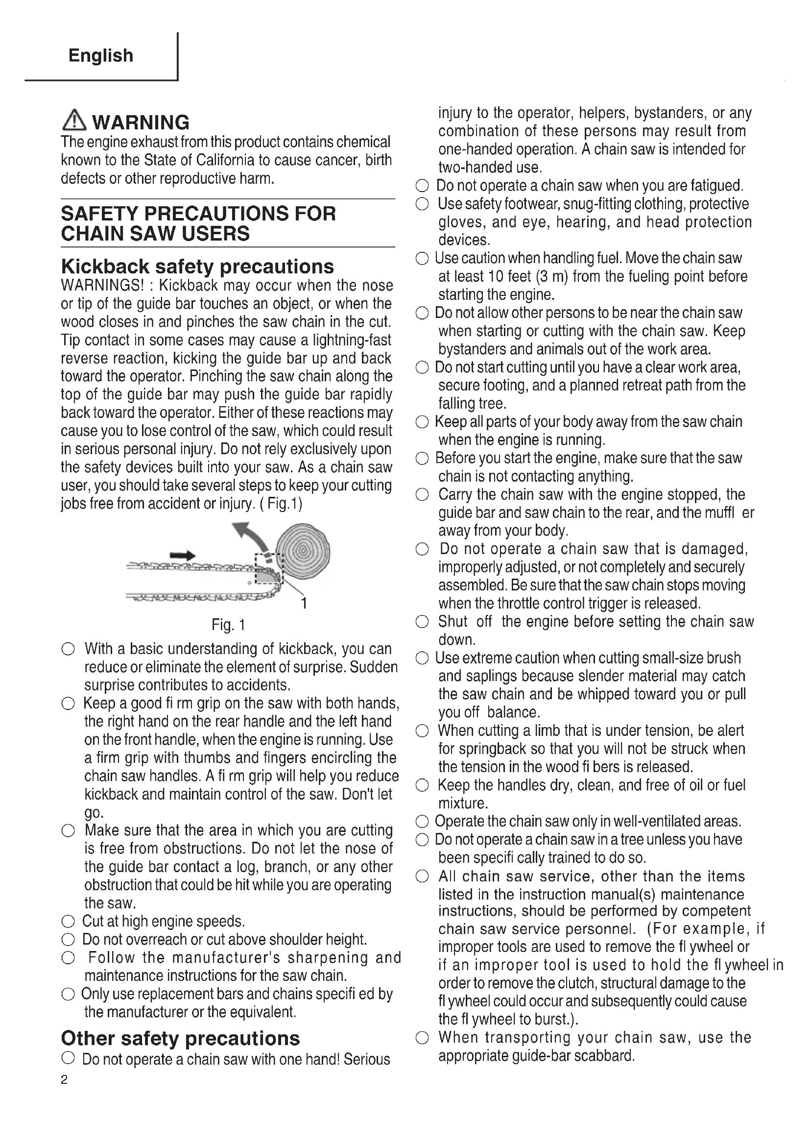 Kickback safety precautions WARNINGS! : Kickback may occur when the nose or tip of the guide bar touches an object, or when the wood closes in and pinches the saw chain in the cut. Tip contact in some cases may cause a lightning-fast reverse reaction, kicking the guide bar up and back toward the operator. Pinching the saw chain along the top of the guide bar may push the guide bar rapidly back toward the operator. Either of these reactions may cause you to lose control of the saw, which could result in serious personal injury. Do not rely exclusively upon the safety devices built into your saw. As a chain saw user, you should take several steps to keep your cutting jobs free from accident or injury. ( Fig.1)