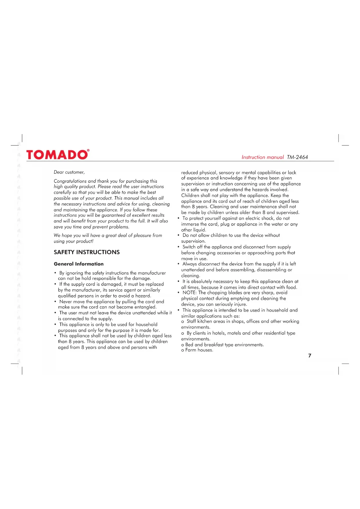 - The warranty does not apply when defects or damages result from an accident, misuse, negligence (e.g. incorrect cleansing), or when repairs of alterations have been executed outside the authorized TOMADO service centre (excl. disassembling, as stated in the instruction manual).