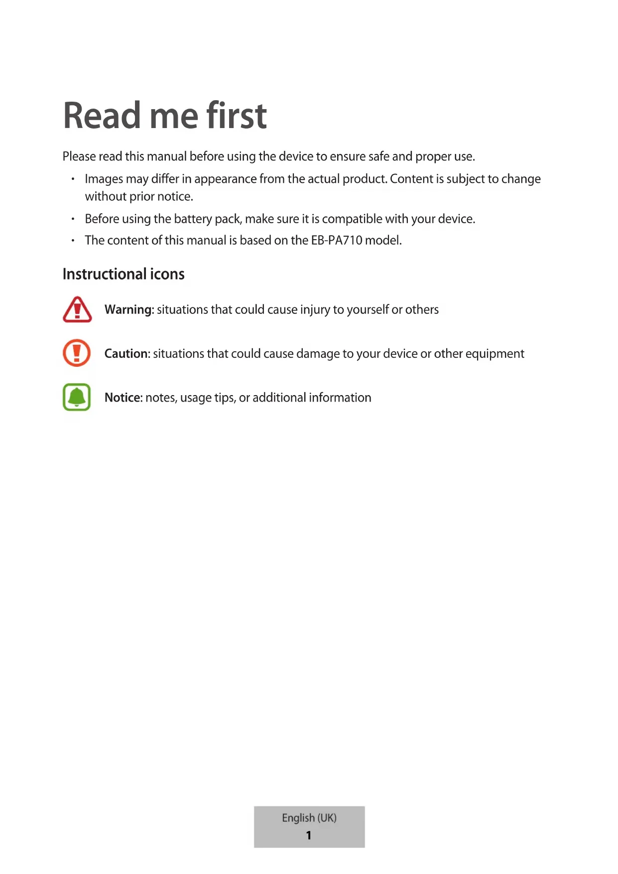 Caution: situations that could cause damage to your device or other equipment Notice: notes, usage tips, or additional information English (UK)