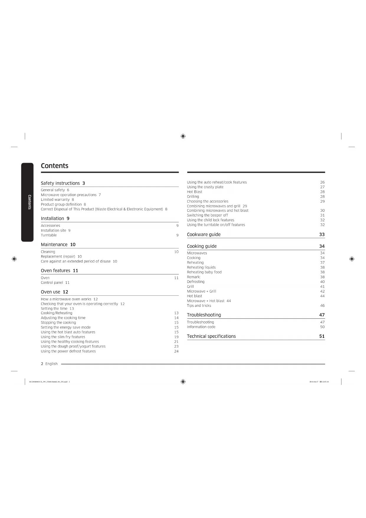 Microwave Oven User manual MC28M6065** MC28M6065CK_SW_DE68-04444L-01_EN.indd 1 2018-04-17 12:05:102 English Contents Contents Safety instructions 3 General safety 6 Microwave operation precautions 7 Limited warranty 8 Product group denition 8 Correct Disposal of This Product (Waste Electrical & Electronic Equipment) 8 Installation 9 Accessories 9 Installation site 9 Turntable 9 Maintenance 10 Cleaning 10 Replacement (repair) 10 Care against an extended period of disuse 10 Oven features 11 Oven 11 Control panel 11 Oven use 12 How a microwave oven works 12 Checking that your oven is operating correctly 12 Setting the time 13 Cooking/Reheating 13 Adjusting the cooking time 14 Stopping the cooking 15 Setting the energy save mode 15 Using the hot blast auto features 15 Using the slim fry features 19 Using the healthy cooking features 21 Using the dough proof/yogurt features 23 Using the power defrost features 24 Using the auto reheat/cook features 26 Using the crusty plate 27 Hot Blast 28 Grilling 28 Choosing the accessories 29 Combining microwaves and grill 29 Combining microwaves and hot blast 30 Switching the beeper off 31 Using the child lock features 32 Using the turntable on/off features 32 Cookware guide 33 Cooking guide 34 Microwaves 34 Cooking 34 Reheating 37 Reheating liquids 38 Reheating baby food 38 Remark: 38 Defrosting 40 Grill 41 Microwave + Grill 42 Hot blast 44 Microwave + Hot blast 44 Tips and tricks 46 Troubleshooting 47 Troubleshooting 47 Information code 50 Technical specications 51 MC28M6065CK_SW_DE68-04444L-01_EN.indd 2 2018-04-17 12:05:10English 3 Safety instructions