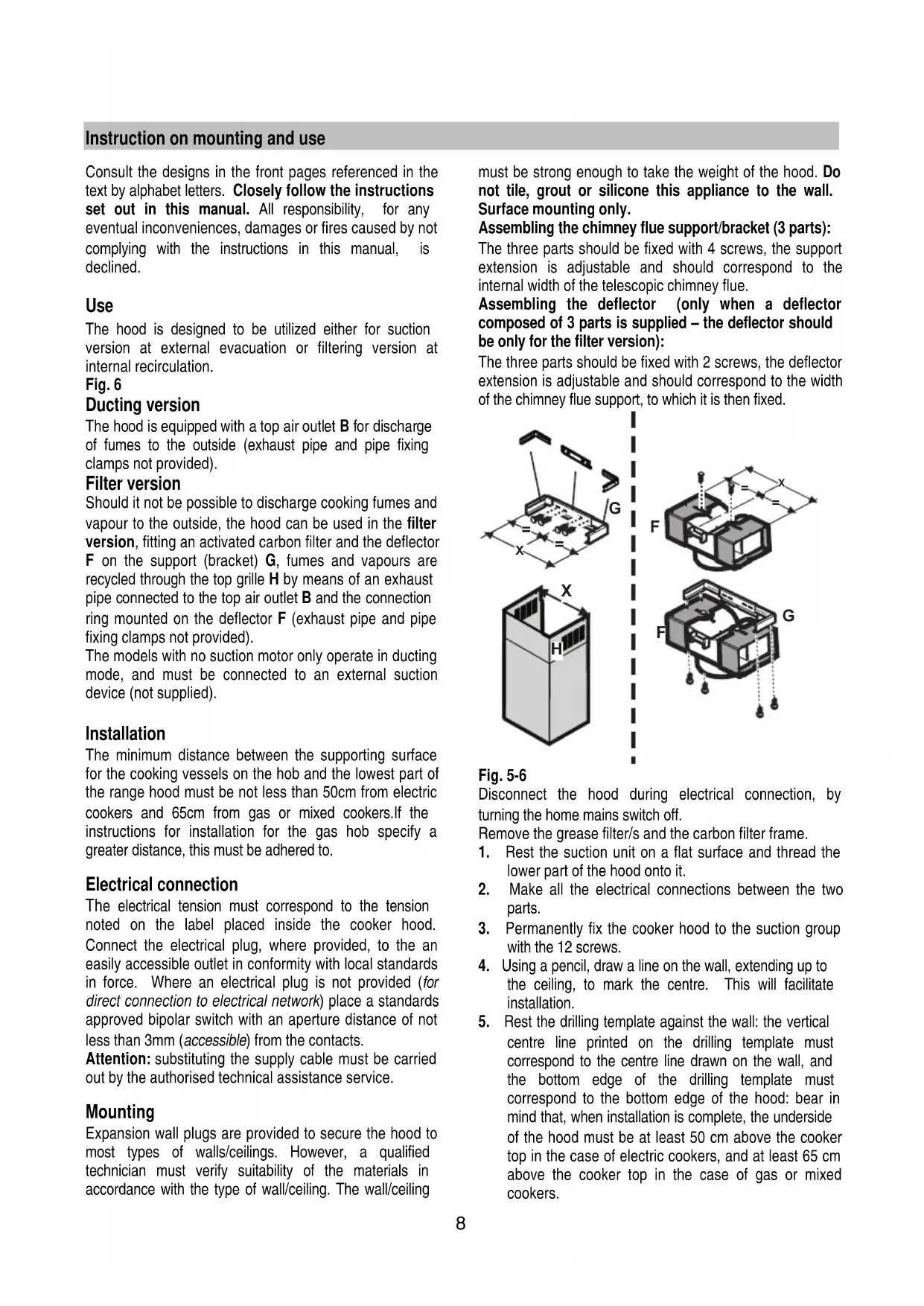to be purchased separately) for discharge of fumes to the connection ring located over the suction motor unit. If the hood is to be used in ducting version, the other end of the pipe must be connected to a device expelling the fumes to the outside. If the hood is to be used in filter version, then fix the deflector F to the chimney support bracket G and connect the other extremity of the pipe to the connection ring placed on the deflector F.