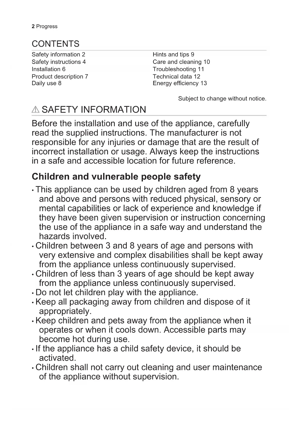 - Children shall not carry out cleaning and user maintenance of the appliance without supervision. 2 ProgressGeneral Safety
