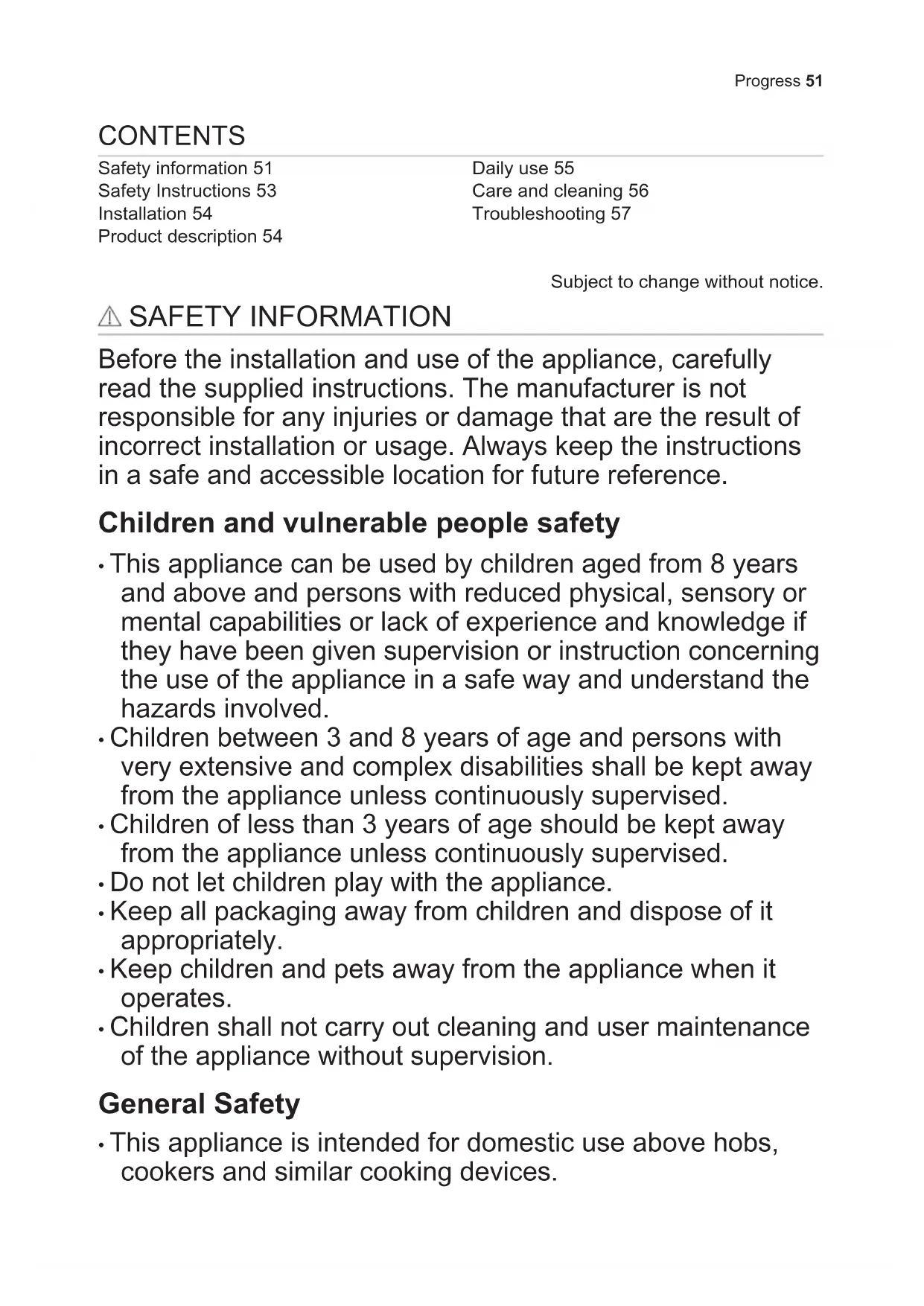 - This appliance is intended for domestic use above hobs, cookers and similar cooking devices. Progress 51• Before carrying out any maintenance, disconnect the appliance from the power supply.