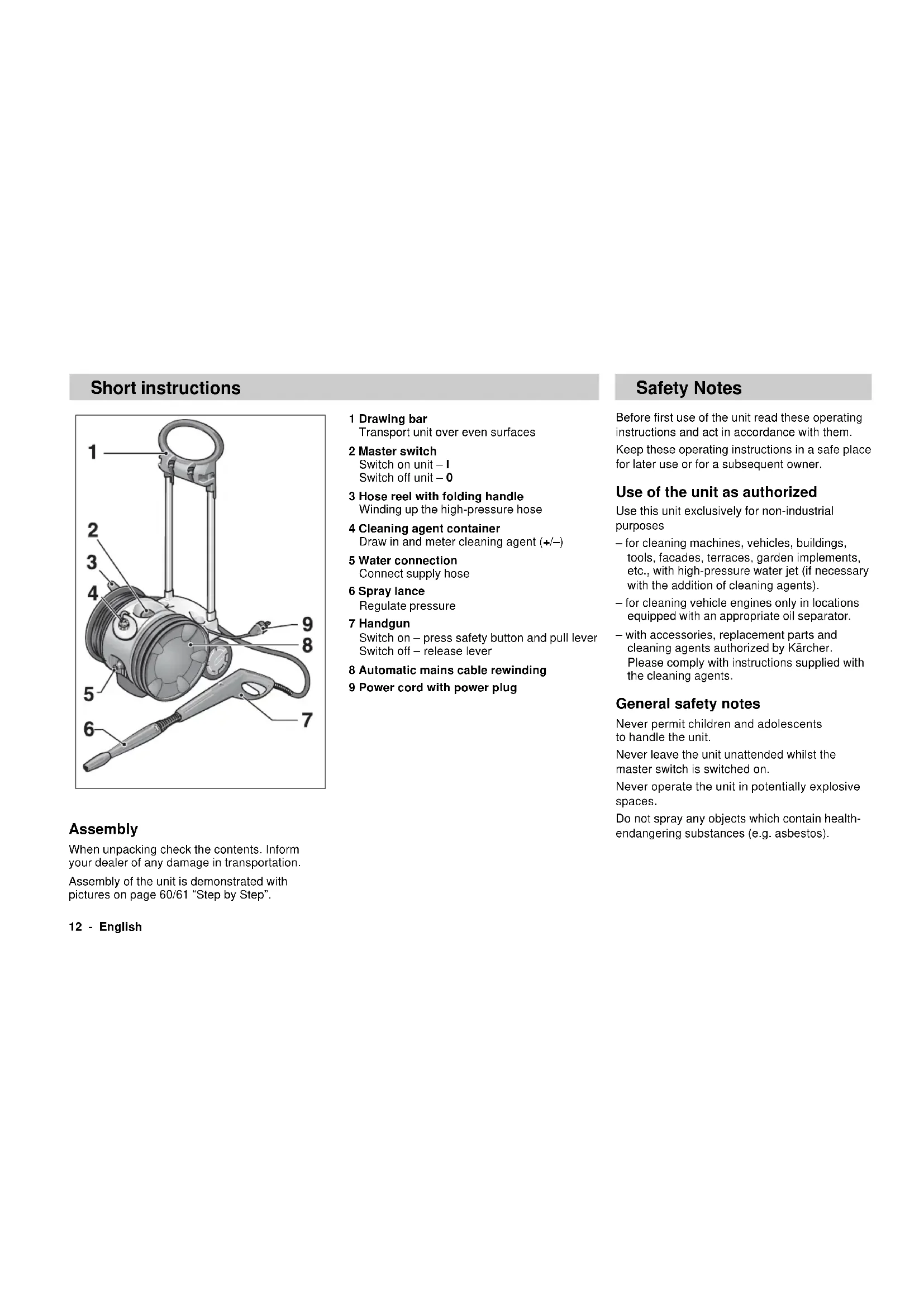 (2000/14/EG) 93 dB(A) Maße Länge/Breite/Höhe 500/410/925 mm Gewicht 21 kg Stromlaufplan C1 Betriebskondensator F1 Thermo-Kontakt M1 Motor S1 Geräteschalter S2 Druckschalter12 - English Short instructions 1 Drawing bar Transport unit over even surfaces 2 Master switch Switch on unit – I Switch off unit – 0 3 Hose reel with folding handle Winding up the high-pressure hose 4 Cleaning agent container Draw in and meter cleaning agent (+/–) 5 Water connection Connect supply hose 6 Spray lance Regulate pressure 7 Handgun Switch on – press safety button and pull lever Switch off – release lever 8 Automatic mains cable rewinding 9 Power cord with power plug Safety Notes Before first use of the unit read these operating instructions and act in accordance with them. Keep these operating instructions in a safe place for later use or for a subsequent owner. Use of the unit as authorized Use this unit exclusively for non-industrial purposes – for cleaning machines, vehicles, buildings, tools, facades, terraces, garden implements, etc., with high-pressure water jet (if necessary with the addition of cleaning agents). – for cleaning vehicle engines only in locations equipped with an appropriate oil separator. – with accessories, replacement parts and cleaning agents authorized by Kärcher. Please comply with instructions supplied with the cleaning agents. General safety notes Never permit children and adolescents to handle the unit. Never leave the unit unattended whilst the master switch is switched on. Never operate the unit in potentially explosive spaces. Do not spray any objects which contain health- endangering substances (e.g. asbestos). Assembly When unpacking check the contents. Inform your dealer of any damage in transportation. Assembly of the unit is demonstrated with pictures on page 60/61 “Step by Step”.English - 13