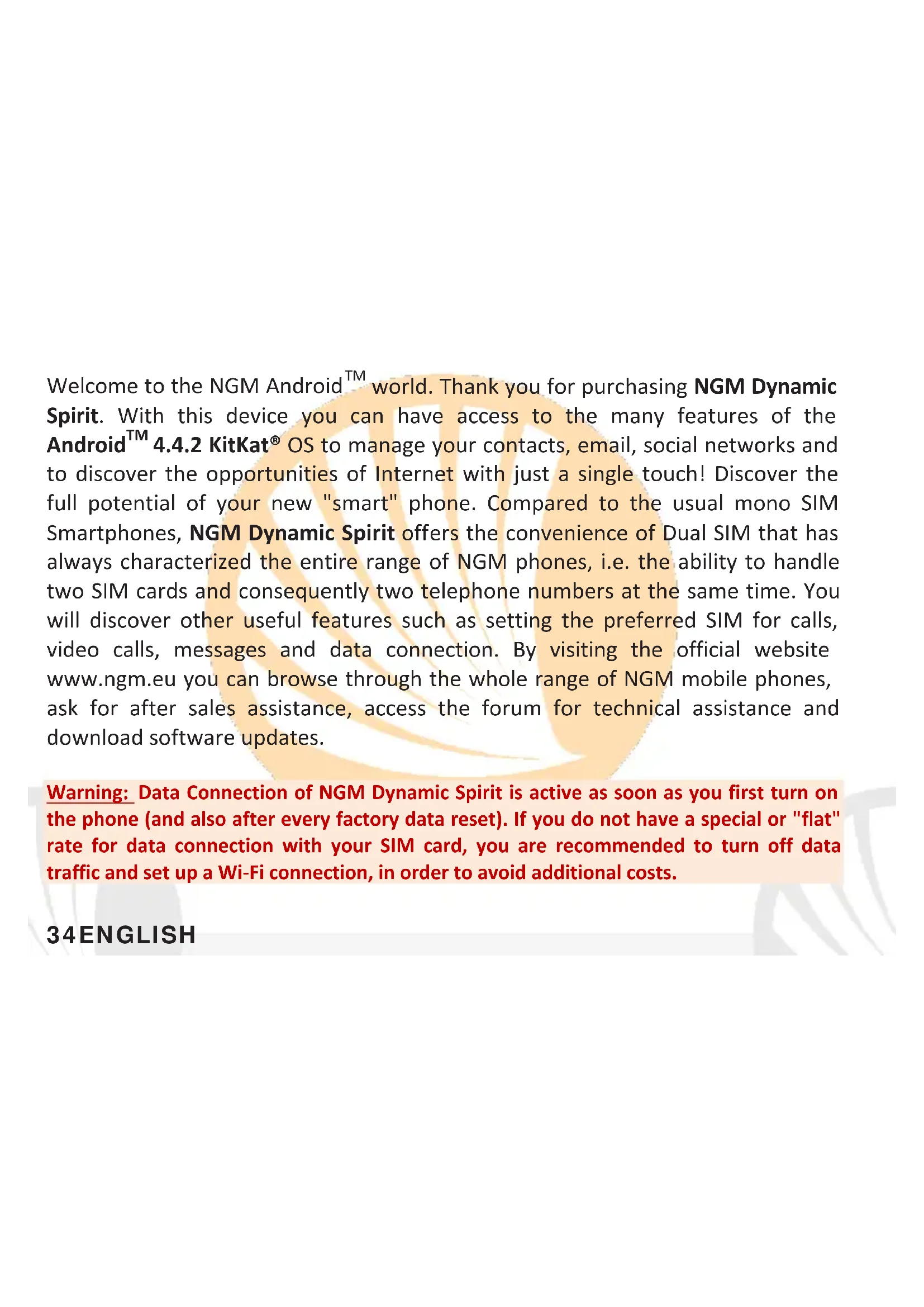 world. Thank you for purchasing NGM Dynamic Spirit. With this device you can have access to the many features of the Android