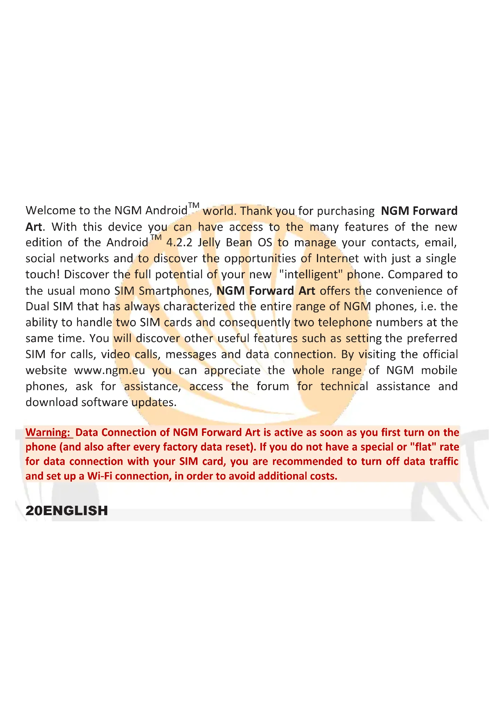 Note: you can set ringtones in *mid,*wav, *ogg or *mp3 formats.31ENGLISH Sending and reading SMS and MMS Reading SMS and MMS: when you receive a new SMS or MMS, an icon appears in the notification panel. By clicking on the appeared icon, you can access directly to the conversation and read the incoming message. In any case, you can view the incoming messages from the home screen or menu, by selecting Messaging. Send SMS and MMS From the Home page or from the main menu, choose Messaging and then the icon the bottom. Type the first letters of a name into the recipient field to search for a contact, select it from the pop-up or directly enter the recipient number, otherwise select the Contacts icon next to the field and check the recipients. Write the text into the dedicated space with the virtual keypad. Select the icon to insert multimedia files (the message will automatically be converted into MMS). Press either Send key, selecting the SIM you want to use. CONNECTIVITY: to better use the potentiality provided by the device and its operating system, you must have an active data connection; data connection of NGM Forward Art is ON when you first power on the phone. If it is not included into your mobile phone plan, data traffic may cause you extra costs, so it is recommended to configure Internet connection via WiFi. To enable data traffic on one of the SIM cards, select Settings > Dual SIM Manager > Data connection, or activate it from the Quick Setup buttons in the notifications panel.32 ENGLISH Connecting to Internet with WiFi® You can connect to WLAN by using the Wi-Fi function. To activate it, choose Settings > WiFi. Please follow all warnings and indications concerning the use of wireless devices in areas where the use of such functions is restricted (airplanes, hospitals, etc.). Go offline mode when you have to use only the functions that do not require Network access.