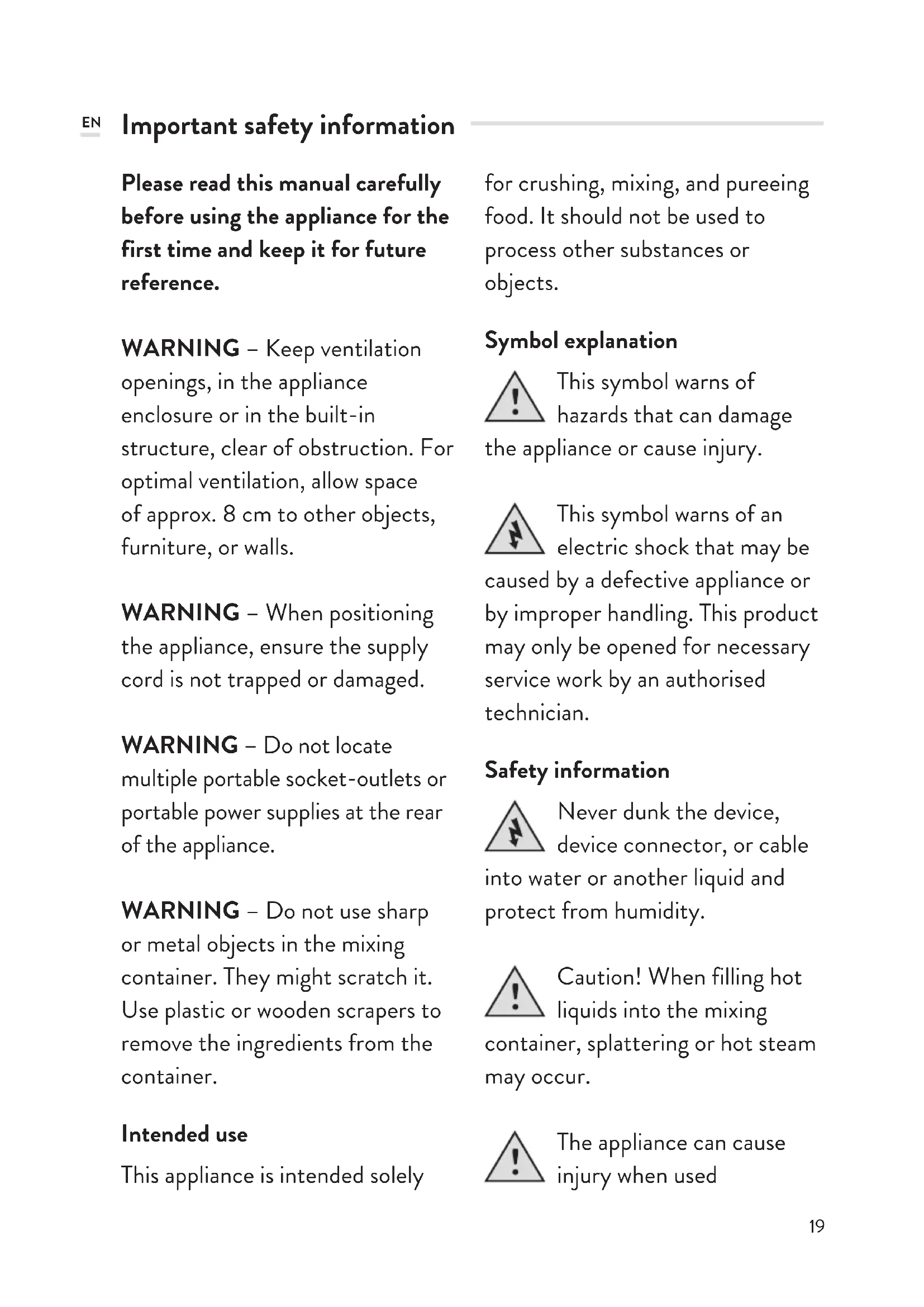 WARNING - Do not use sharp or metal objects in the mixing container. They might scratch it. Use plastic or wooden scrapers to remove the ingredients from the container.