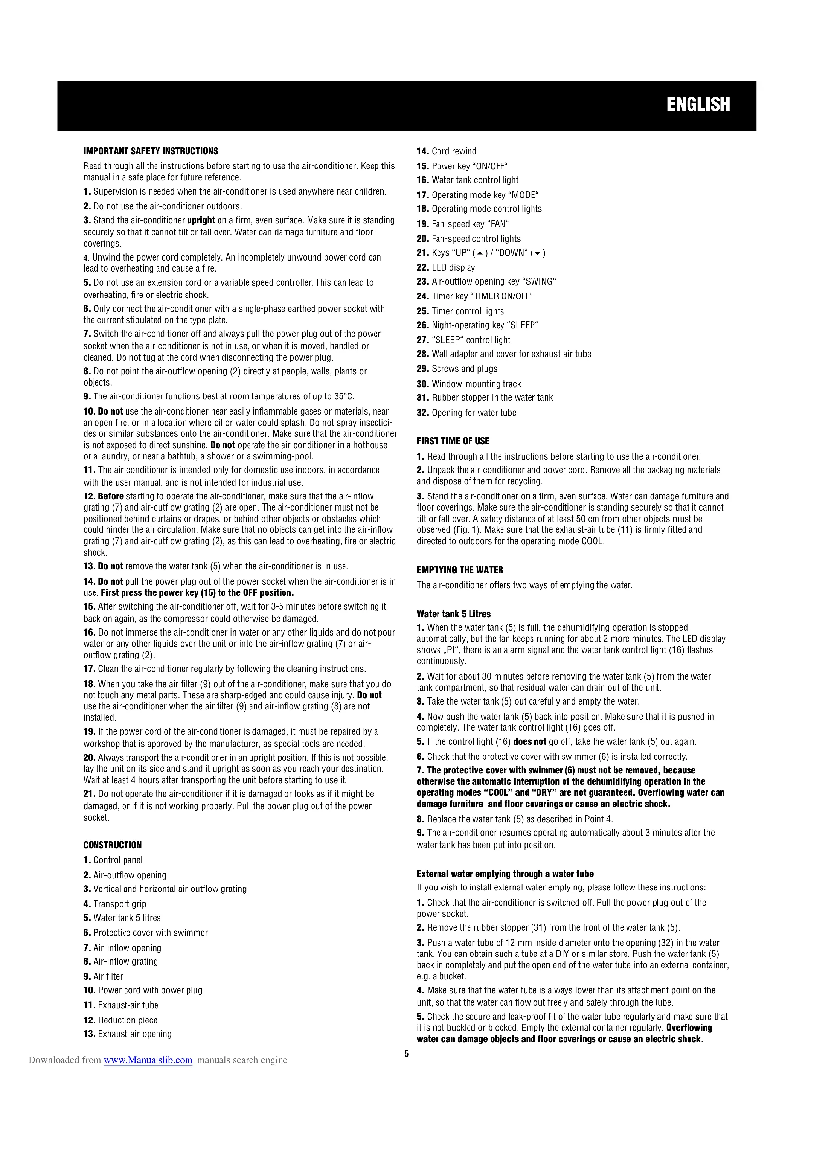 13. Do not remove the water tank (5) when the air-conditioner is in use.