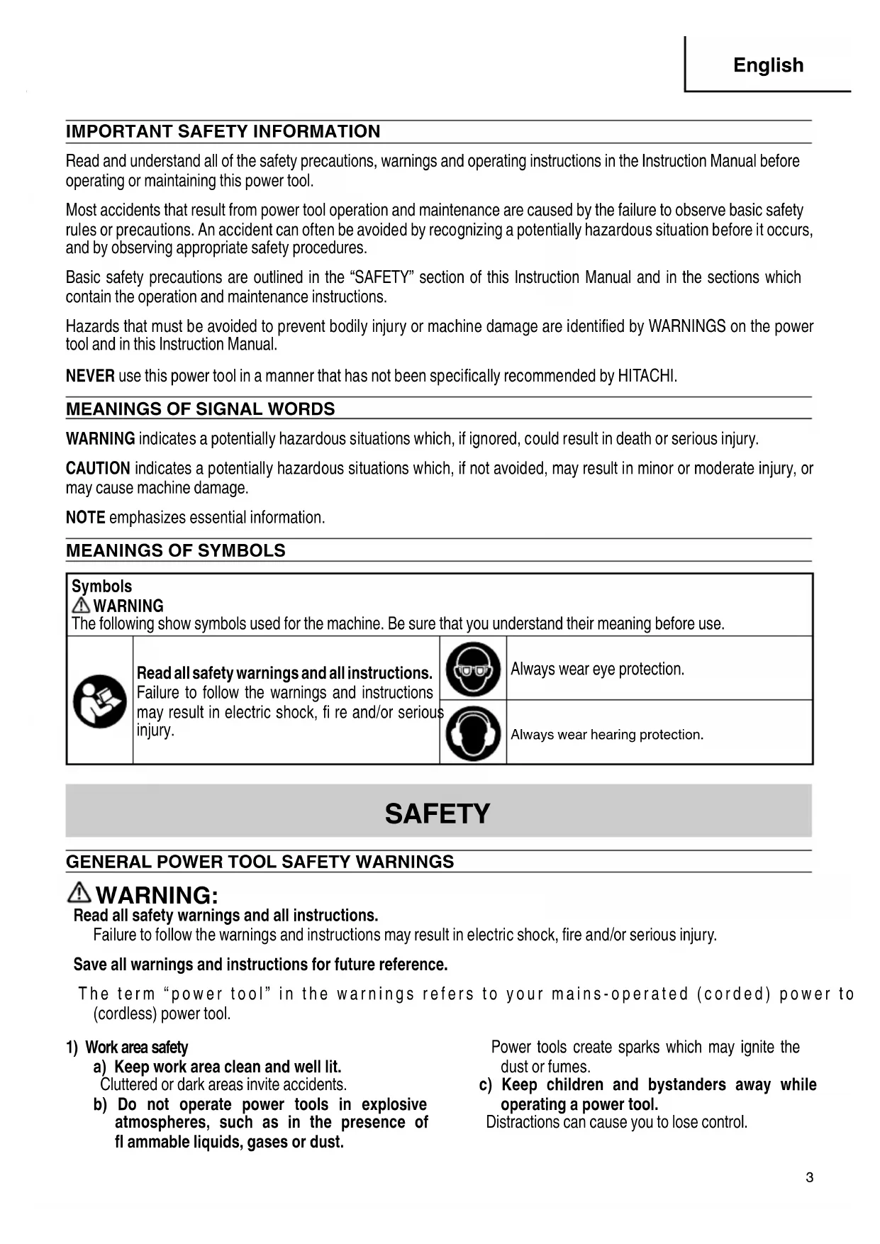 SPECIFICATIONS .................................................26 00BookC7SB3US.indb200BookC7SB3US.indb2 2017/09/1417:57:392017/09/1417:57:39IMPORTANT SAFETY INFORMATION Read and understand all of the safety precautions, warnings and operating instructions in the Instruction Manual before operating or maintaining this power tool. Most accidents that result from power tool operation and maintenance are caused by the failure to observe basic safety rules or precautions. An accident can often be avoided by recognizing a potentially hazardous situation before it occurs, and by observing appropriate safety procedures. Basic safety precautions are outlined in the “SAFETY” section of this Instruction Manual and in the sections which contain the operation and maintenance instructions. Hazards that must be avoided to prevent bodily injury or machine damage are identifi ed by WARNINGS on the power tool and in this Instruction Manual. NEVER use this power tool in a manner that has not been specifi cally recommended by HITACHI.
