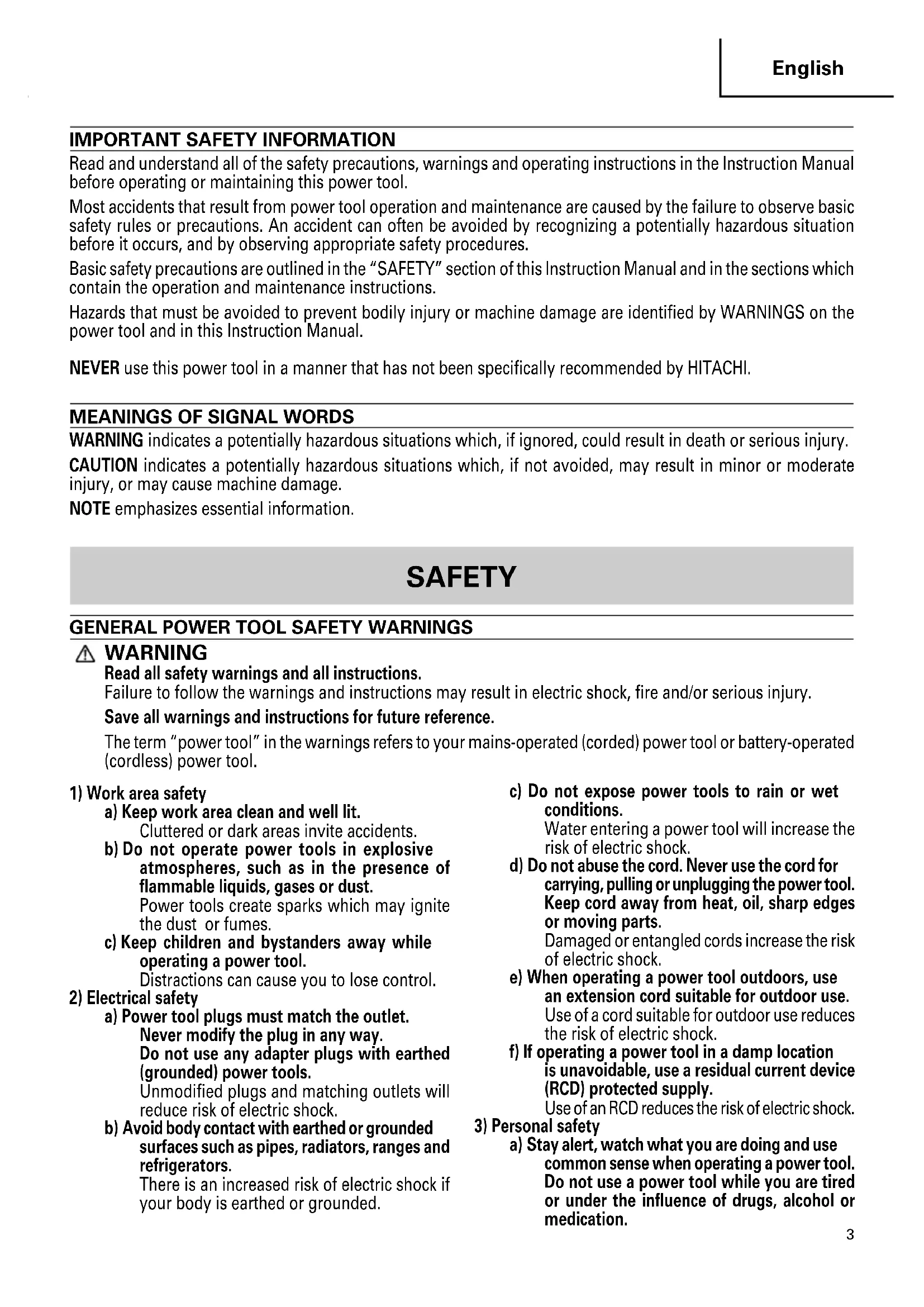Read and understand all of the safety precautions, warnings and operating instructions in the Instruction Manual before operating or maintaining this power tool. Most accidents that result from power tool operation and maintenance are caused by the failure to observe basic safety rules or precautions. An accident can often be avoided by recognizing a potentially hazardous situation before it occurs, and by observing appropriate safety procedures. Basic safety precautions are outlined in the “SAFETY” section of this Instruction Manual and in the sections which contain the operation and maintenance instructions. Hazards that must be avoided to prevent bodily injury or machine damage are identified by WARNINGS on the power tool and in this Instruction Manual. NEVER use this power tool in a manner that has not been specifically recommended by HITACHI.