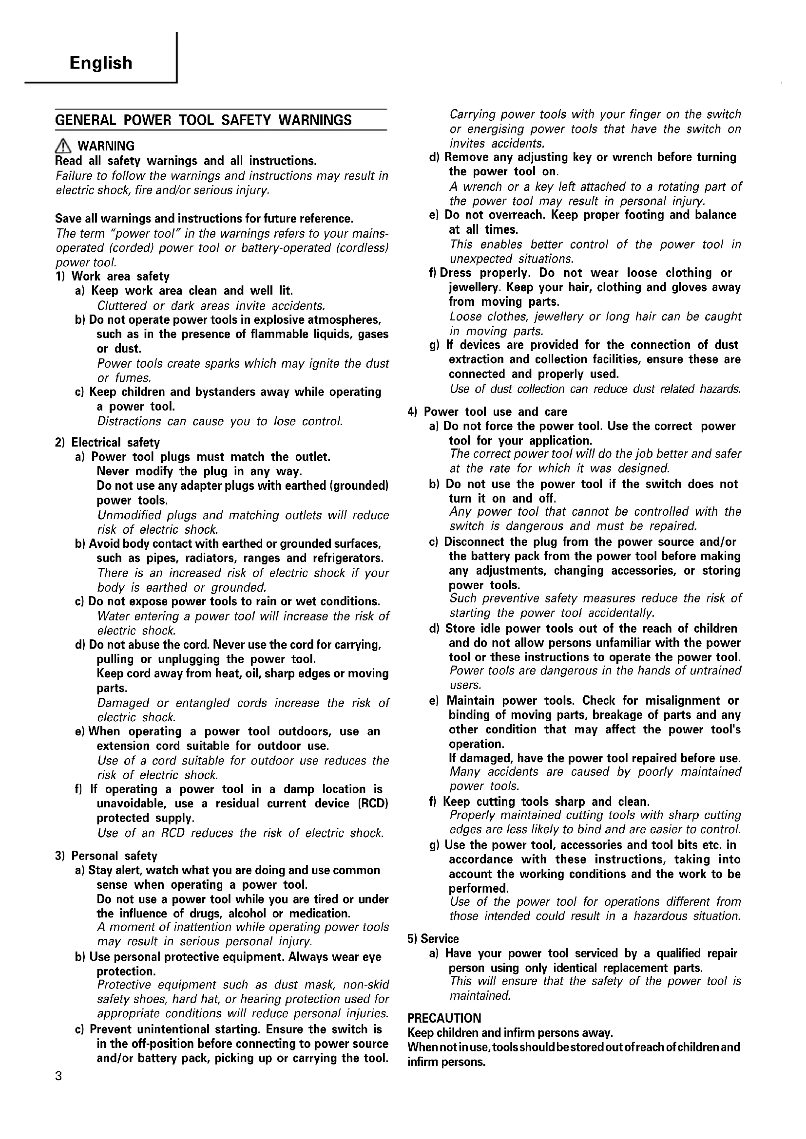 a) Have your power tool serviced by a qualified repair person using only identical replacement parts. This will ensure that the safety of the power tool is maintained. PRECAUTION Keep children and infirm persons away. When not in use, tools should be stored out of reach of children and infirm persons. 01Eng_G10SG_WE 4/20/10, 17:1734 English