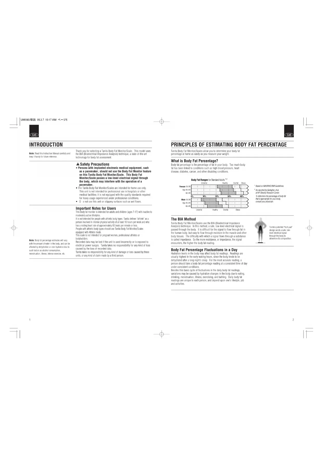 INTRODUCTION Thank you for selecting a Tanita Body Fat Monitor/Scale. This model uses the BIA (Bioelectrical Impedance Analysis) technique, a state-of-the-art technology for body fat assessment. Safety Precautions
