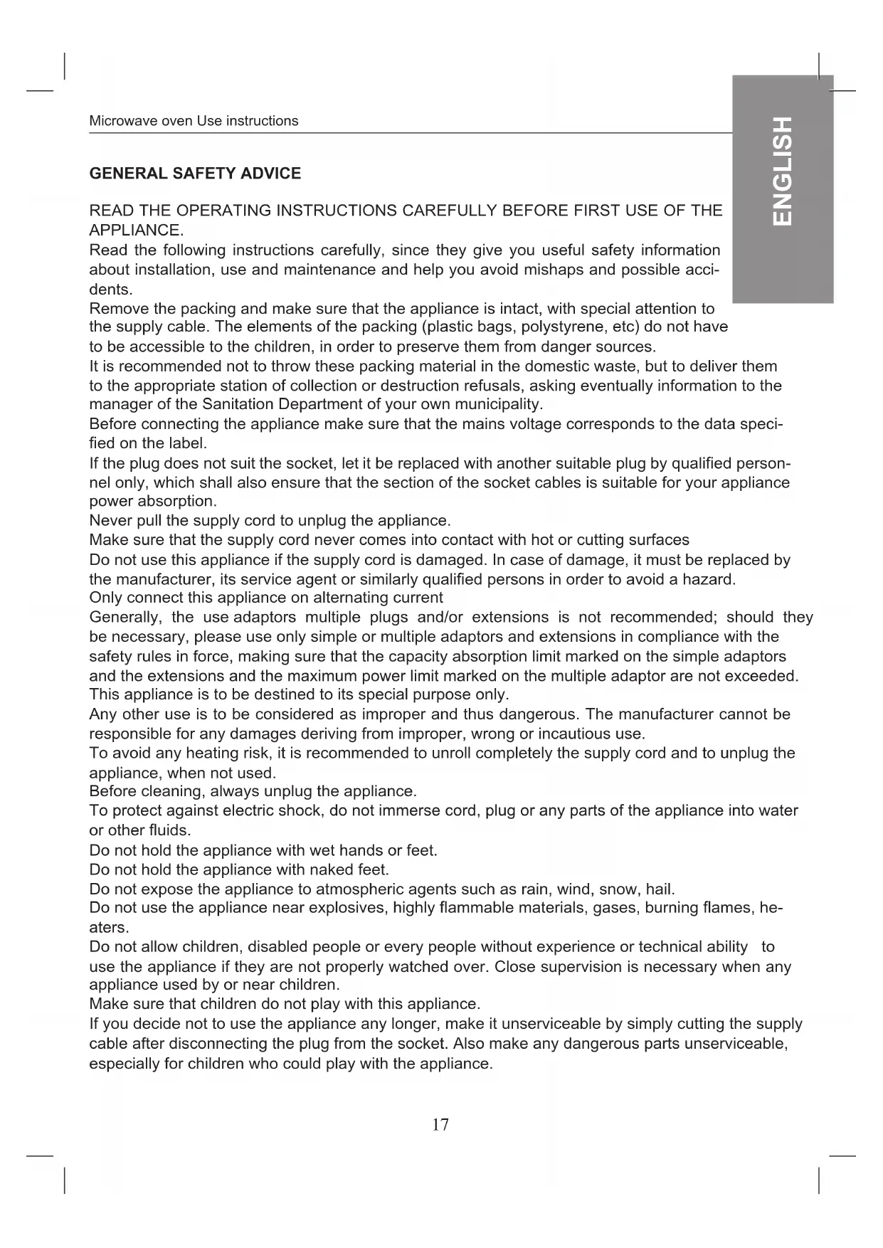If the plug does not suit the socket, let it be replaced with another suitable plug by qualified personnel only, which shall also ensure that the section of the socket cables is suitable for your appliance power absorption.