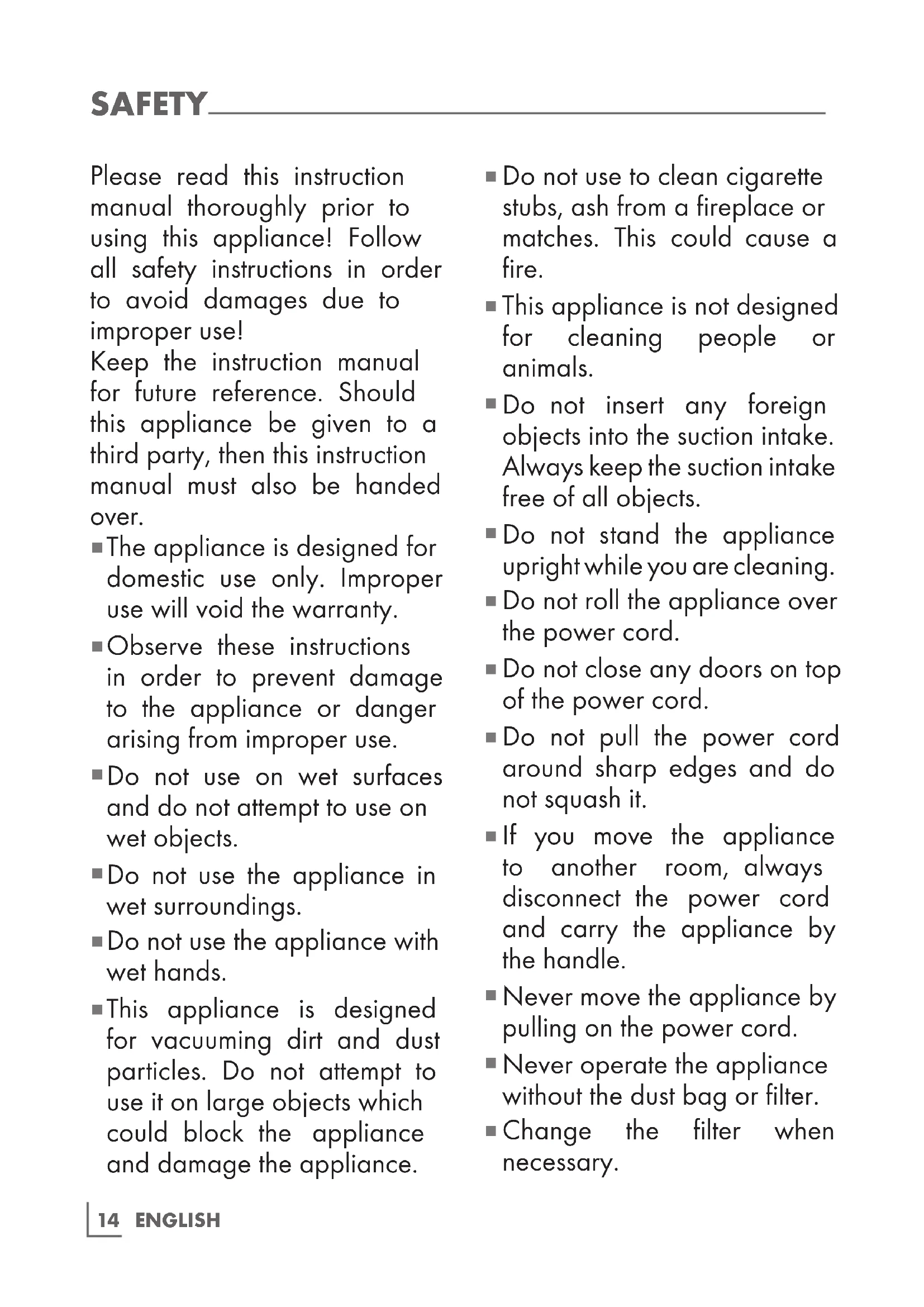 This appliance is designed for vacuuming dirt and dust particles. Do not attempt to use it on large objects which could block the appliance and damage the appliance.