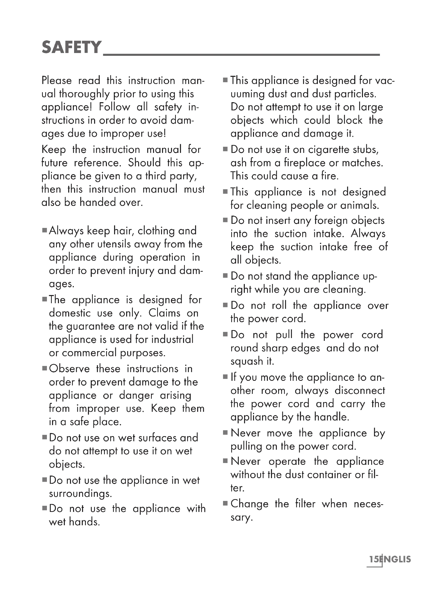 This appliance is designed for vac- uuming dust and dust particles. Do not attempt to use it on large objects which could block the appliance and damage it.