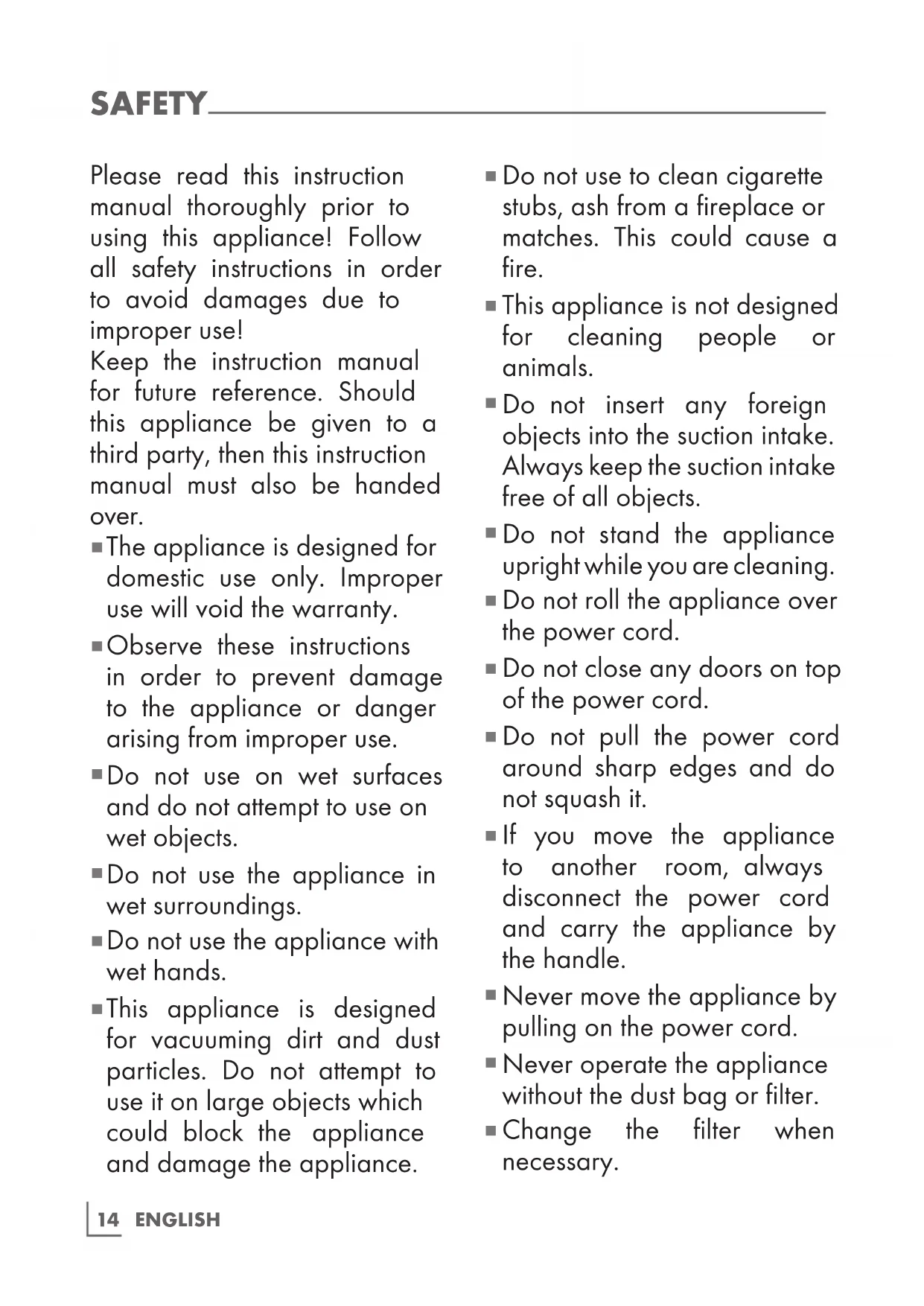 This appliance is designed for vacuuming dirt and dust particles. Do not attempt to use it on large objects which could block the appliance and damage the appliance.
