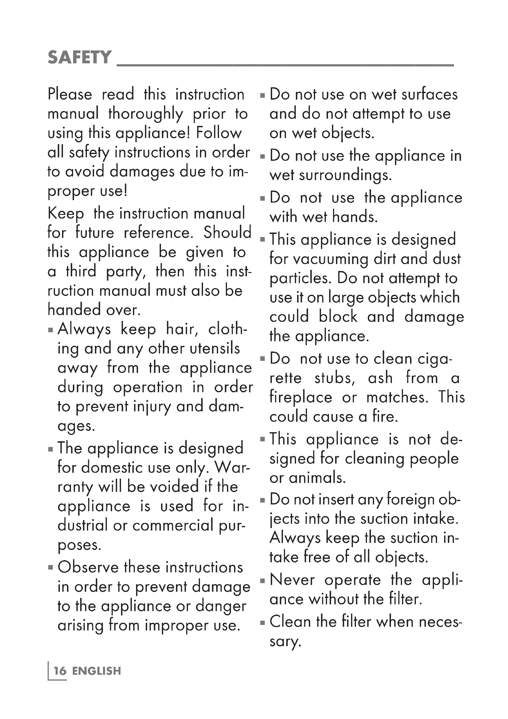 This appliance is designed for vacuuming dirt and dust particles. Do not attempt to use it on large objects which could block and damage the appliance.