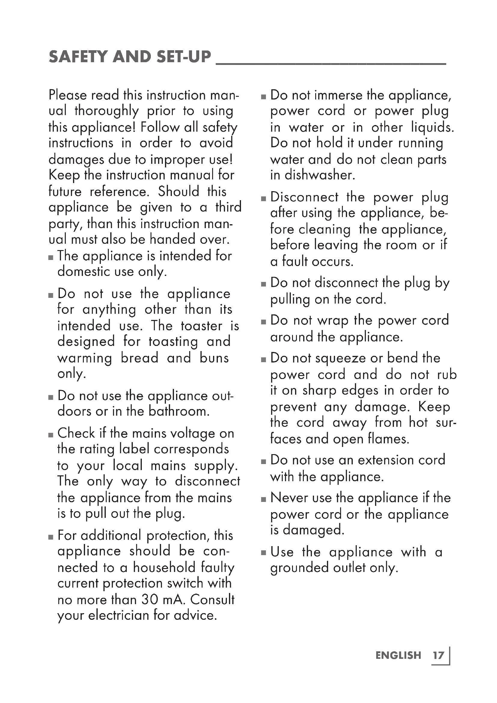 Do not use the appliance for anything other than its intended use. The toaster is designed for toasting and warming bread and buns only.