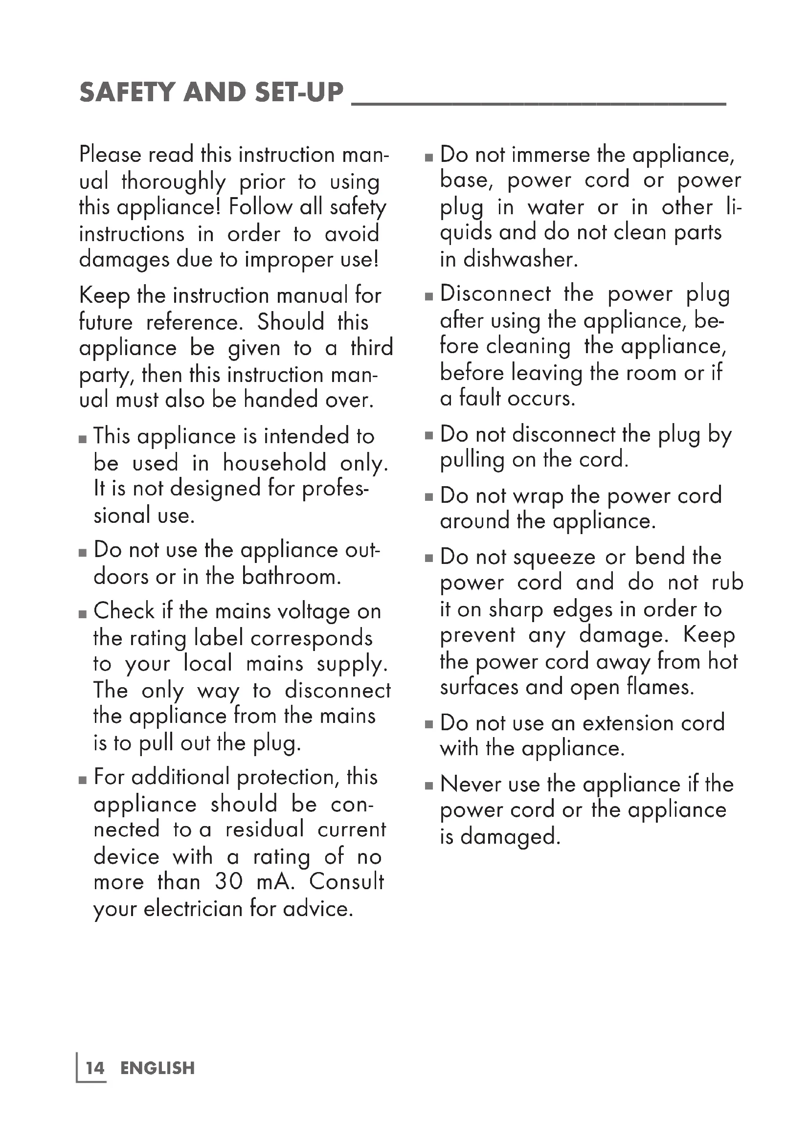 Never use the appliance if the power cord or the appliance is damaged.15 ENGLISH