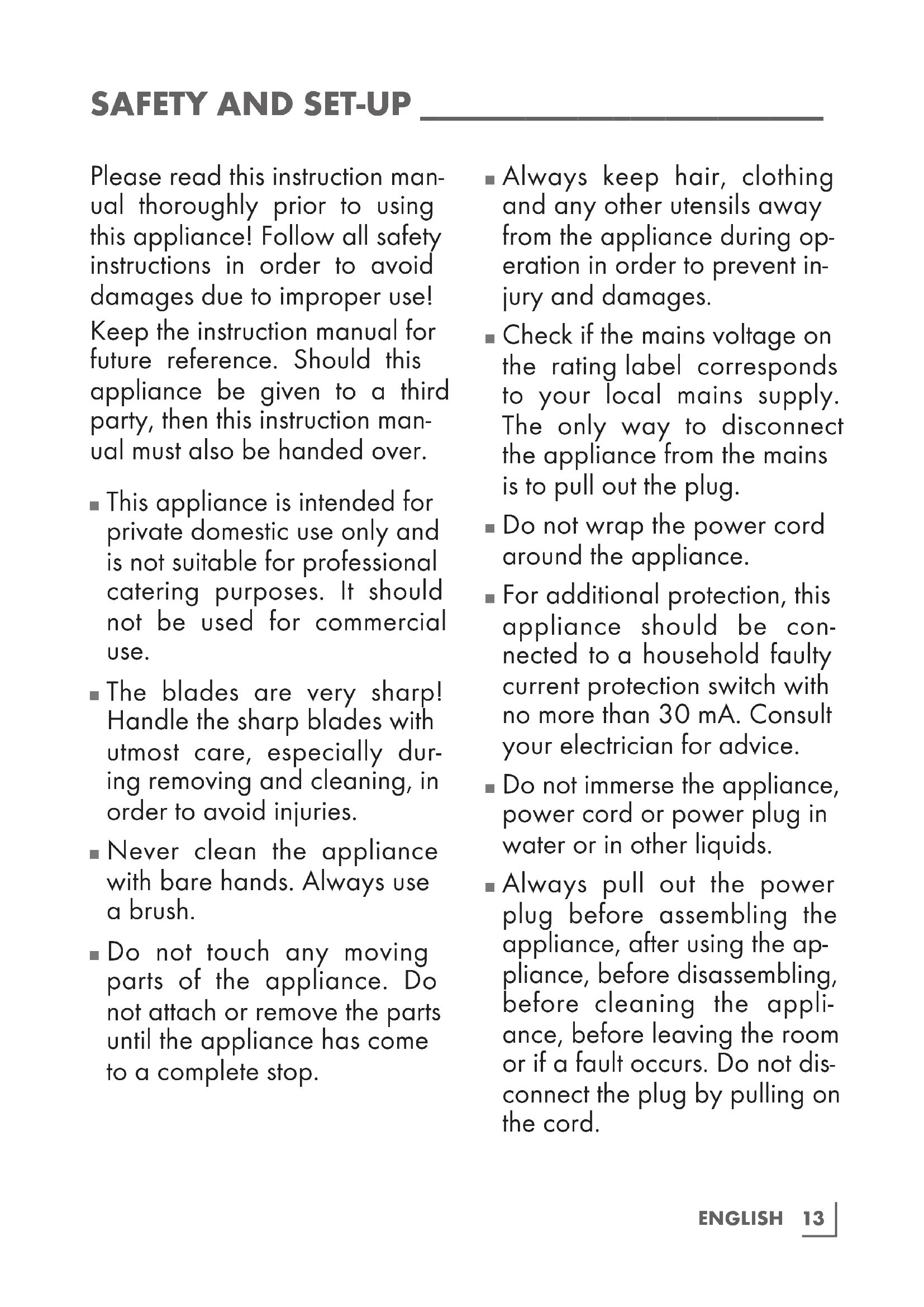 Always pull out the power plug before assembling the appliance, after using the ap- pliance, before disassembling, before cleaning the appli- ance, before leaving the room or if a fault occurs. Do not dis- connect the plug by pulling on the cord.14 ENGLISH
