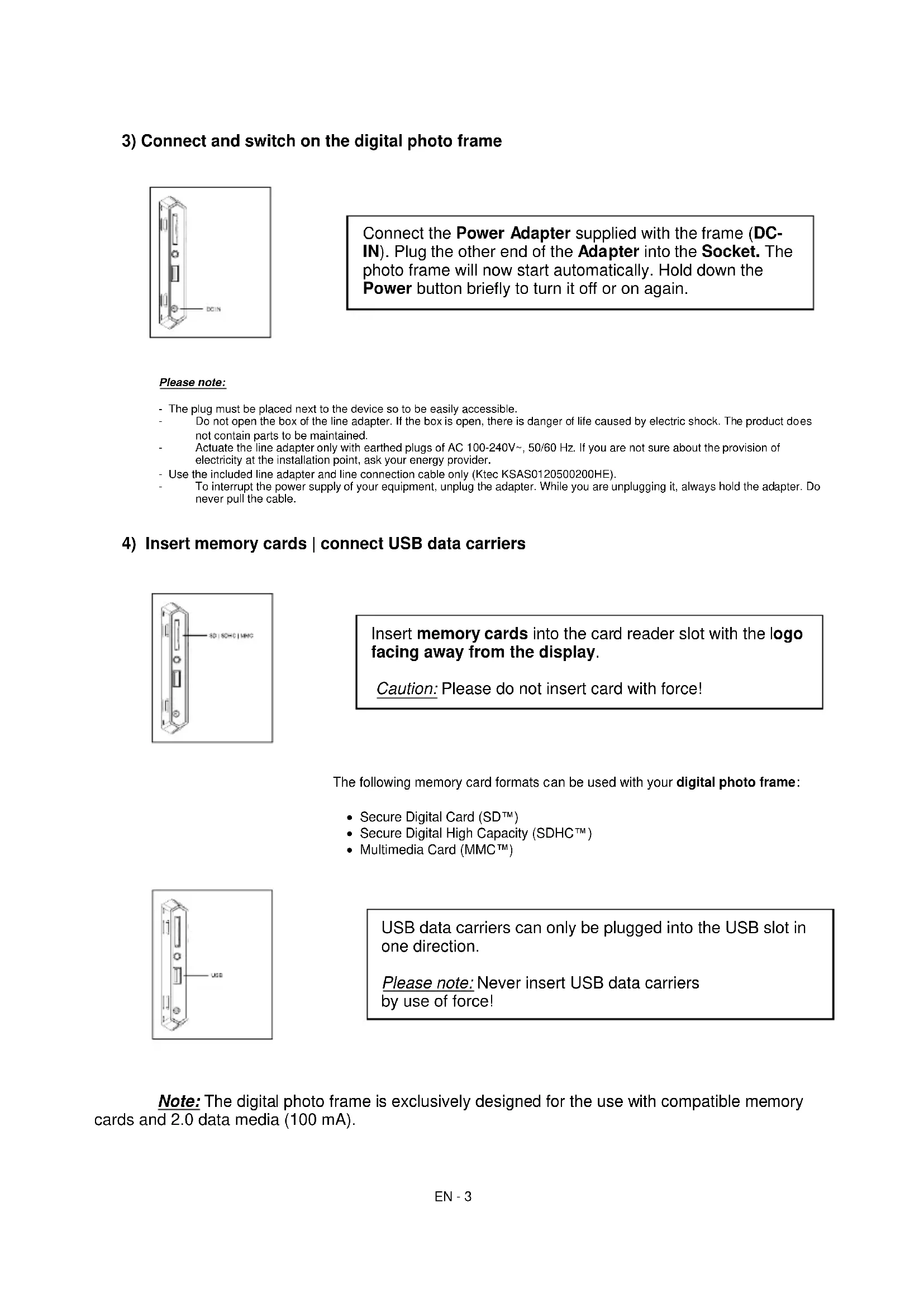 Note: The digital photo frame is exclusively designed for the use with compatible memory cards and 2.0 data media (100 mA). Secure Digital Card (SD™) Secure Digital High Capacity (SDHC™) Multimedia Card (MMC™) Insert memory cards into the card reader slot with the logo facing away from the display. Caution: Please do not insert card with force! USB data carriers can only be plugged into the USB slot in one direction. Please note: Never insert USB data carriers by use of force! Connect the Power Adapter supplied with the frame (DC- IN). Plug the other end of the Adapter into the Socket. The photo frame will now start automatically. Hold down the Power button briefly to turn it off or on again.EN - 4