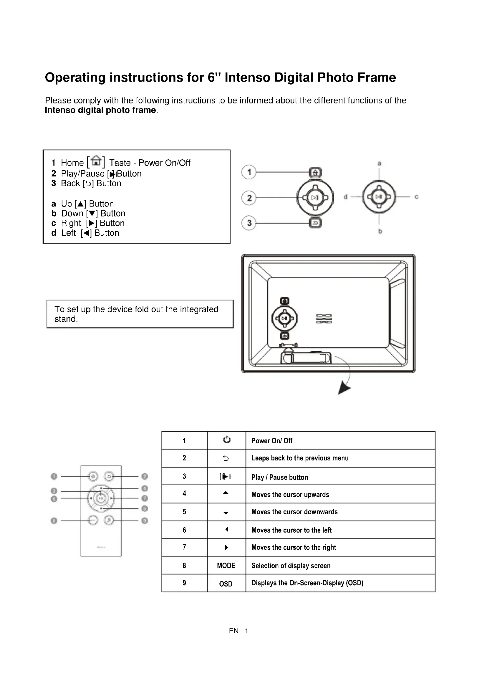 To set up the device fold out the integrated stand. 1 Home [ ] Taste - Power On/Off 2 Play/Pause [ ] Button 3 Back [] Button a Up [] Button b Down [] Button c Right [] Button d Left [] ButtonEN - 2