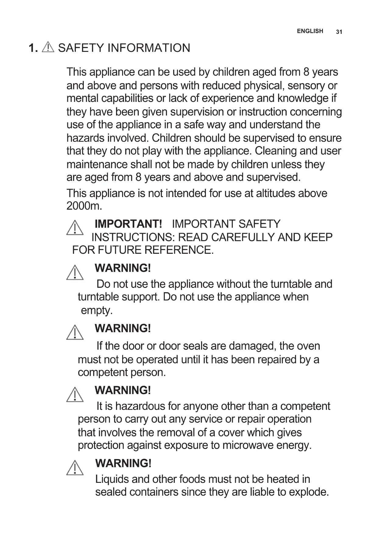 We recommend the use of original spare parts. When contacting Service, ensure that you have the following data available. The information can be found on the rating plate. Model, PNC, Serial Number. Subject to change without notice. Warning/Caution-Safety information General information and tips Environmental information Get usage advice, brochures, trouble shooter, service information: www.aeg.com Register your product for better service: www.registeraeg.com Buy Accessories, Consumables and Original spare parts for your appliance: www.aeg.com/shop 1. SAFETY INFORMATION .................................................................................................. 31 2. INSTALLATION .................................................................................................................35