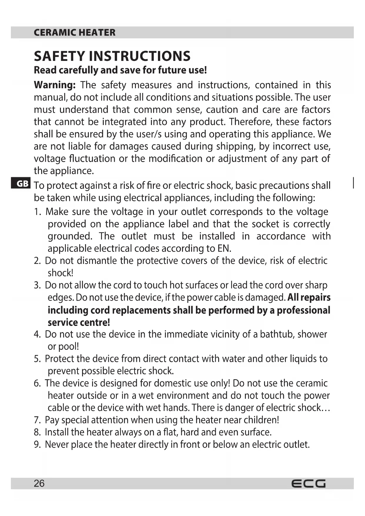 - The device is designed for domestic use only! Do not use the ceramic heater outside or in a wet environment and do not touch the power cable or the device with wet hands. There is danger of electric shock...