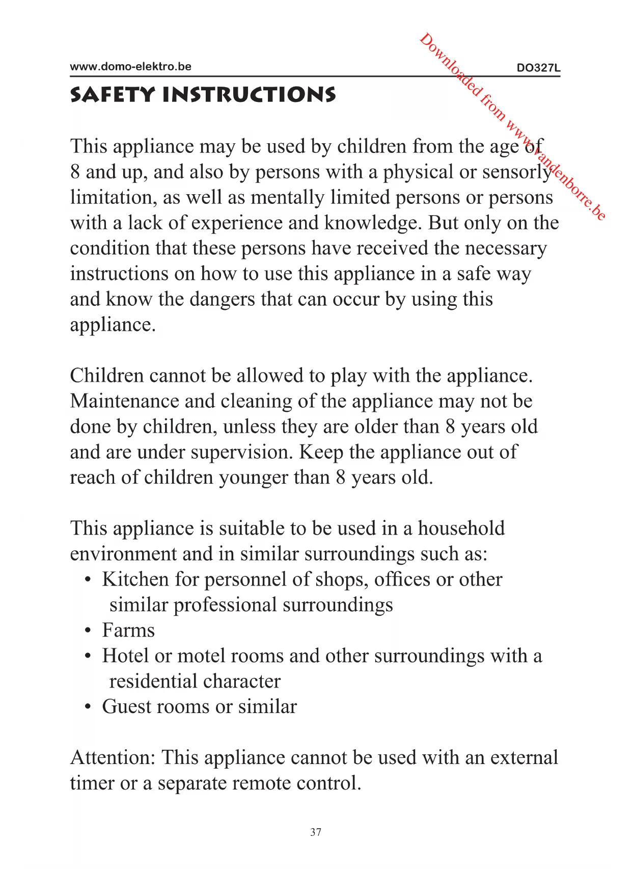 • Always use the appliance on a steady, dry and level surface. - Only use the appliance for domestic use. The manufacturer can not be held responsible for accidents that result from improper use of the appliance or not following the instructions described in this manual.