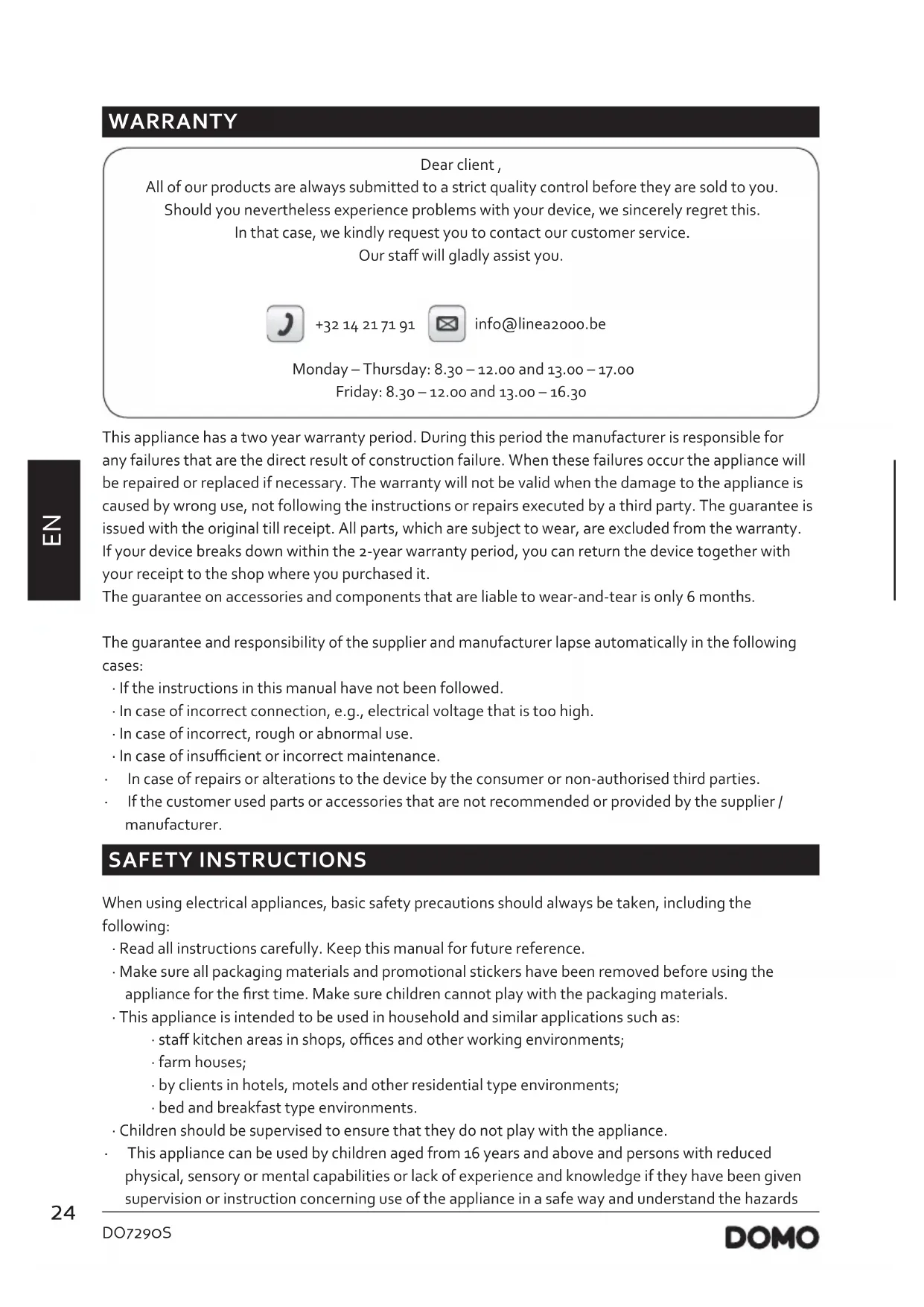 WARRANTY Dear client , All of our products are always submitted to a strict quality control before they are sold to you. Should you nevertheless experience problems with your device, we sincerely regret this. In that case, we kindly request you to contact our customer service. Our sta will gladly assist you. +32 14 21 71 91 info@linea2000.be Monday – Thursday: 8.30 – 12.00 and 13.00 – 17.00 Friday: 8.30 – 12.00 and 13.00 – 16.30 This appliance has a two year warranty period. During this period the manufacturer is responsible for any failures that are the direct result of construction failure. When these failures occur the appliance will be repaired or replaced if necessary. The warranty will not be valid when the damage to the appliance is caused by wrong use, not following the instructions or repairs executed by a third party. The guarantee is issued with the original till receipt. All parts, which are subject to wear, are excluded from the warranty. If your device breaks down within the 2-year warranty period, you can return the device together with your receipt to the shop where you purchased it. The guarantee on accessories and components that are liable to wear-and-tear is only 6 months. The guarantee and responsibility of the supplier and manufacturer lapse automatically in the following cases: