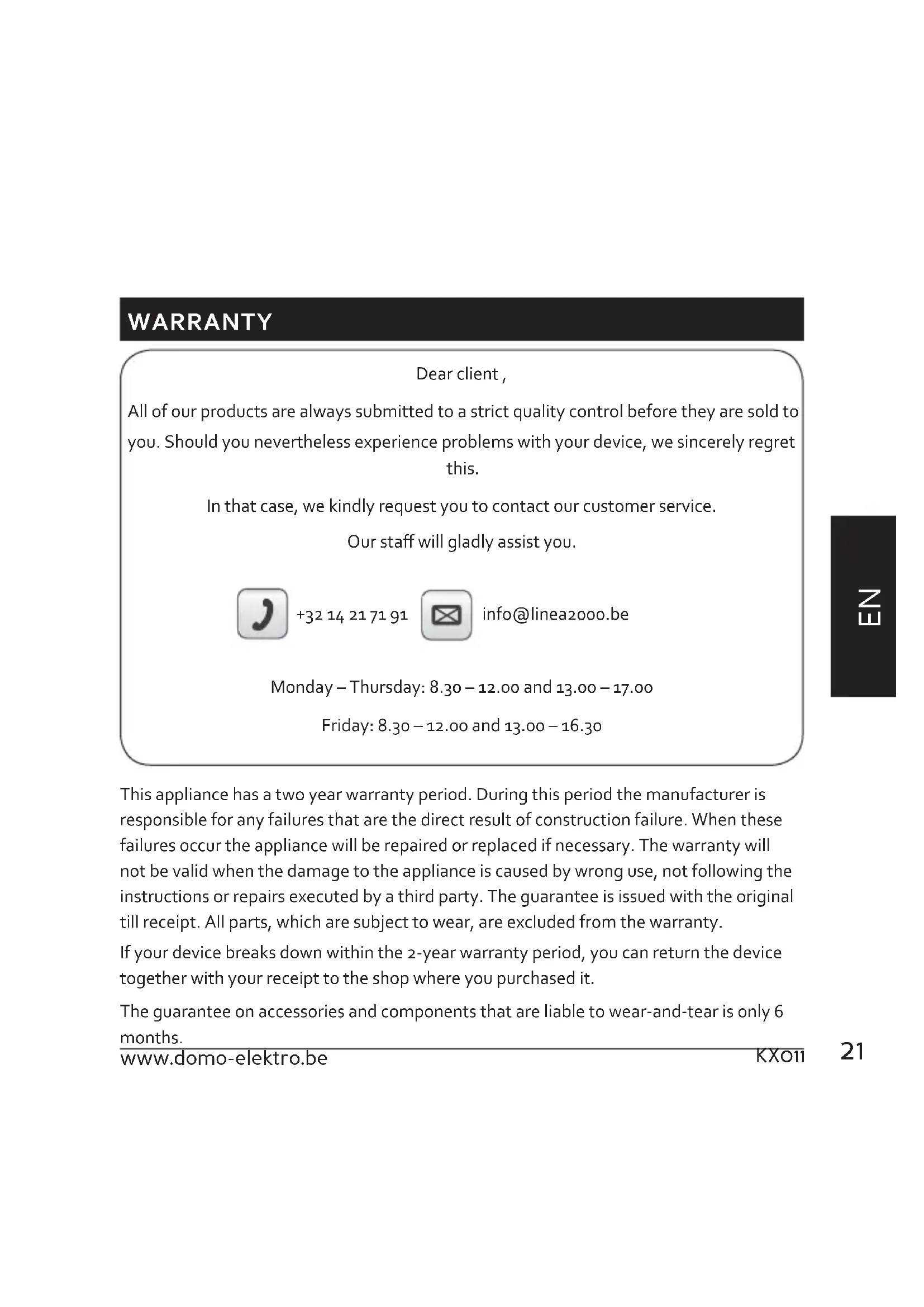 This appliance has a two year warranty period. During this period the manufacturer is responsible for any failures that are the direct result of construction failure. When these failures occur the appliance will be repaired or replaced if necessary. The warranty will not be valid when the damage to the appliance is caused by wrong use, not following the instructions or repairs executed by a third party. The guarantee is issued with the original till receipt. All parts, which are subject to wear, are excluded from the warranty.